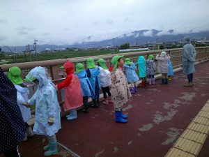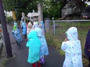 ・「雨楽しいね」と言ったり散歩しながらスキップをしたりする姿がありました。発見を楽しみながらのよろめき散歩もたくさんしていきたいと思います。また、虹探ししようね。