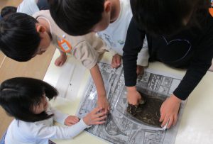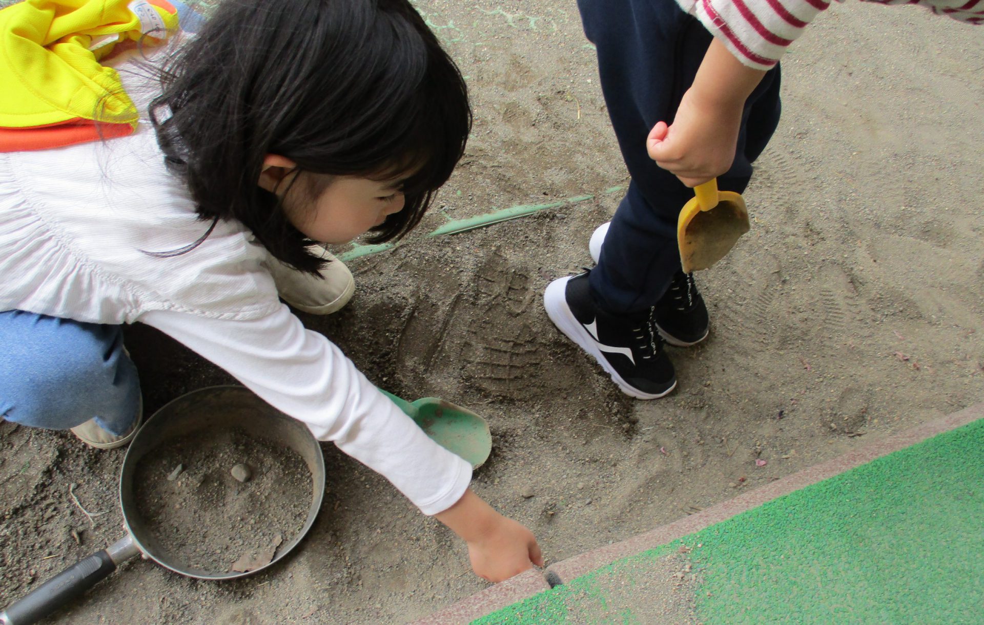 保育園の園庭で、アリが沢山集まっている場所を見つけた子ども達。