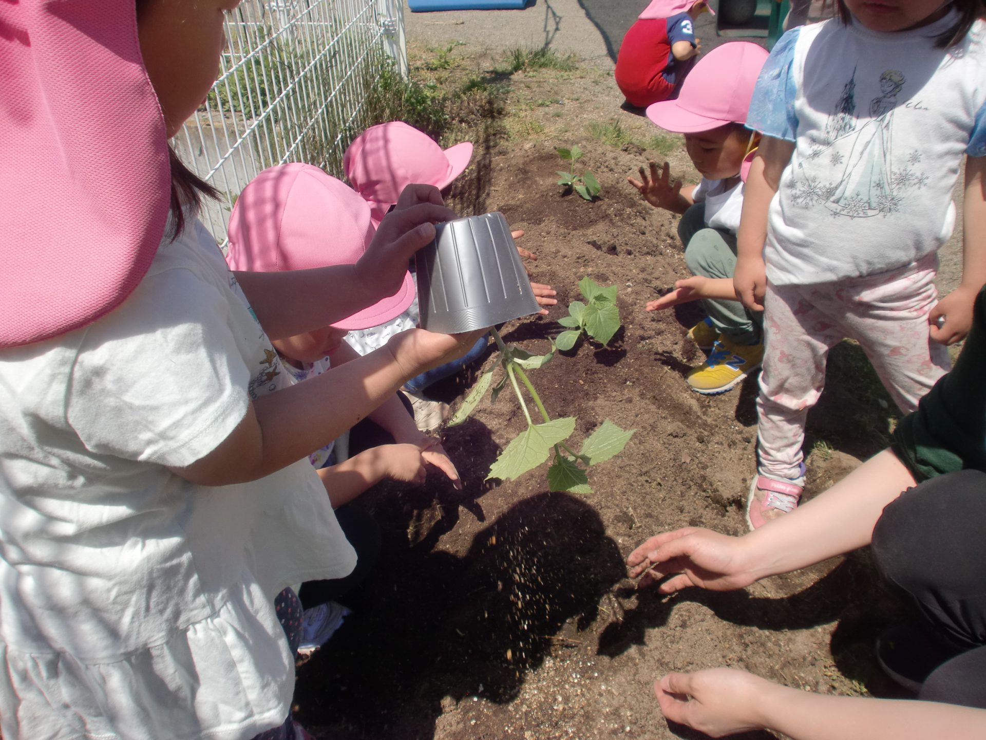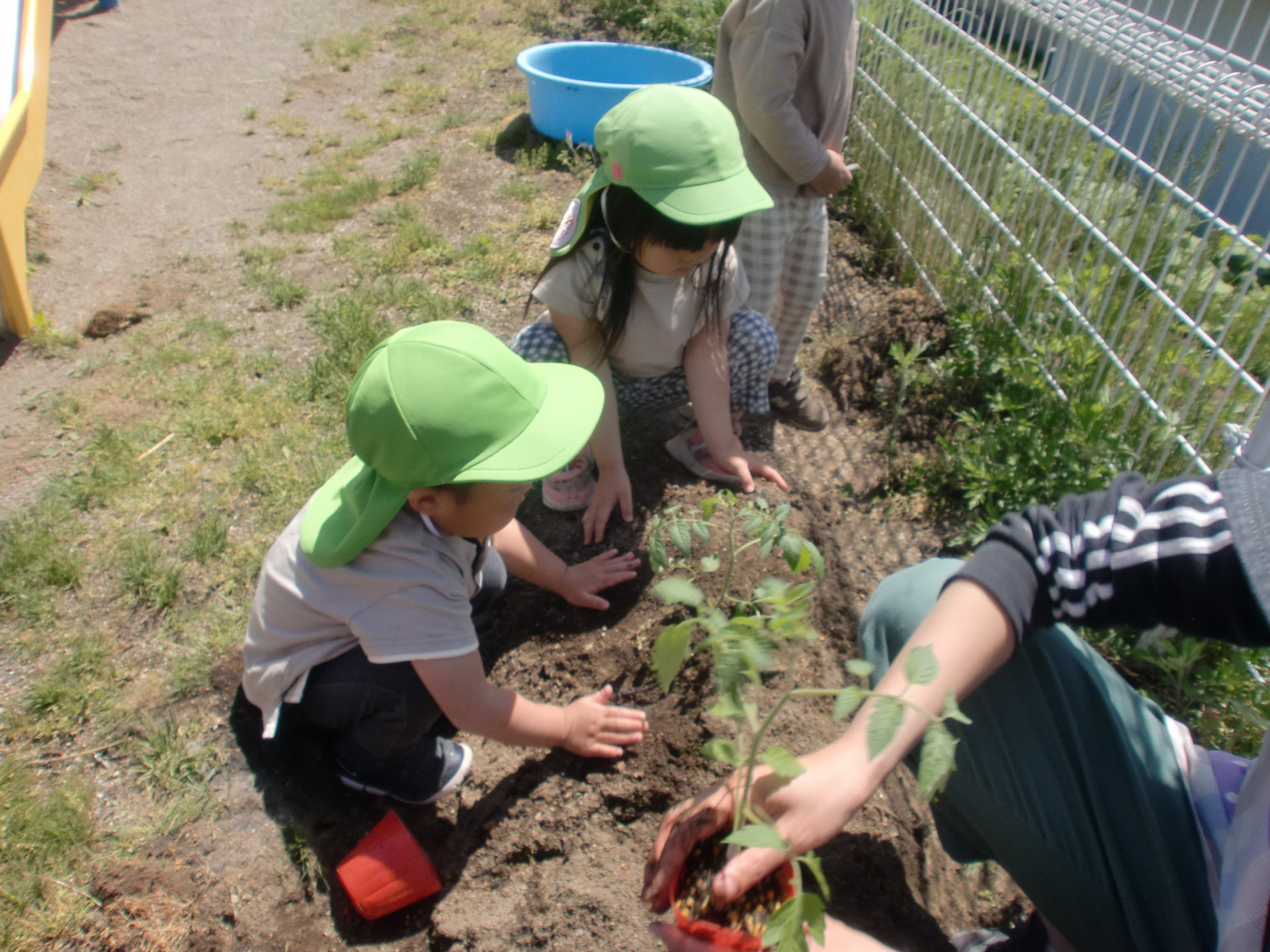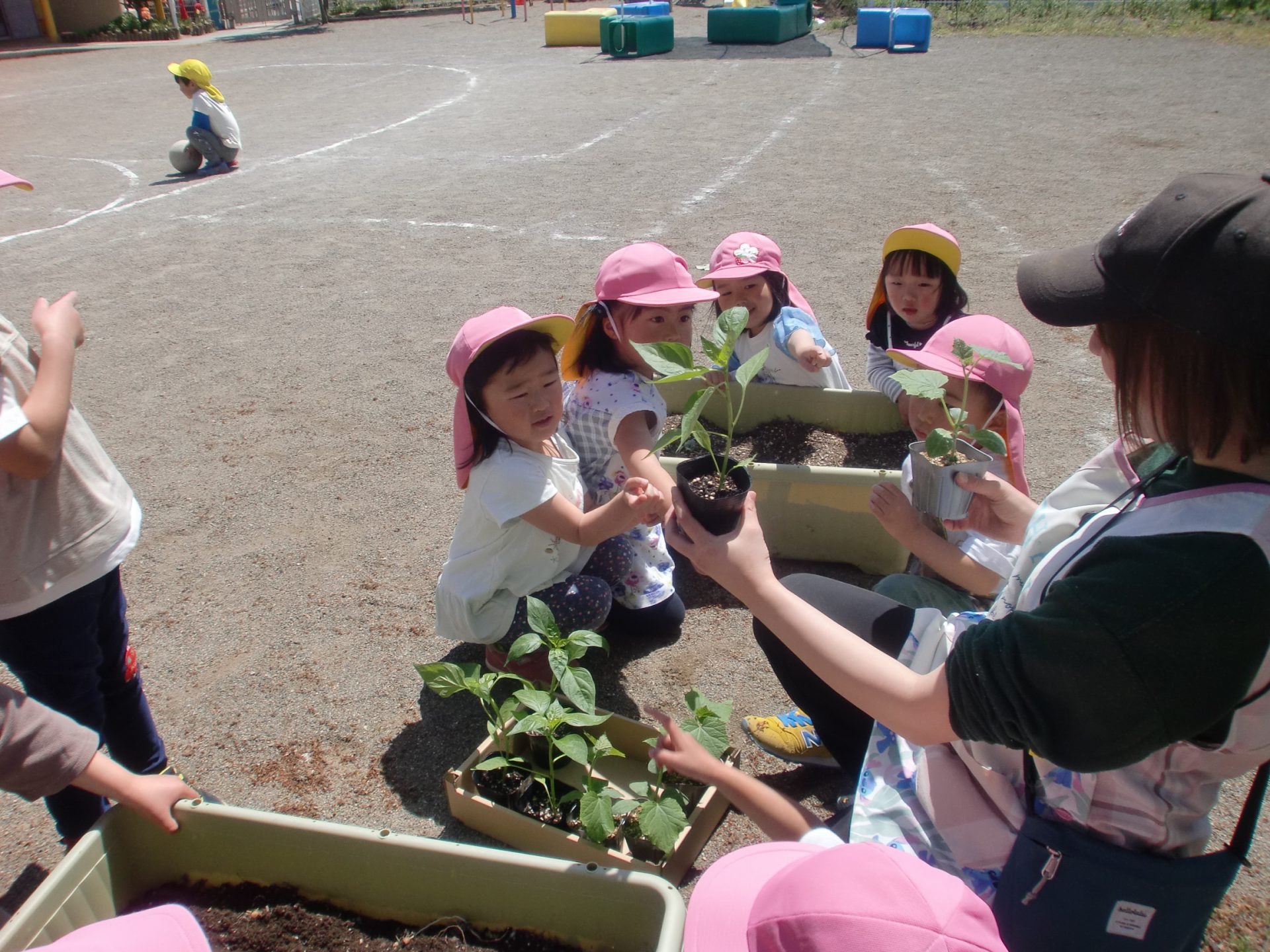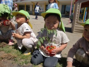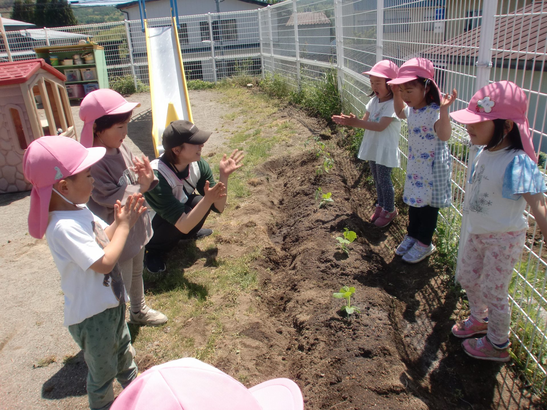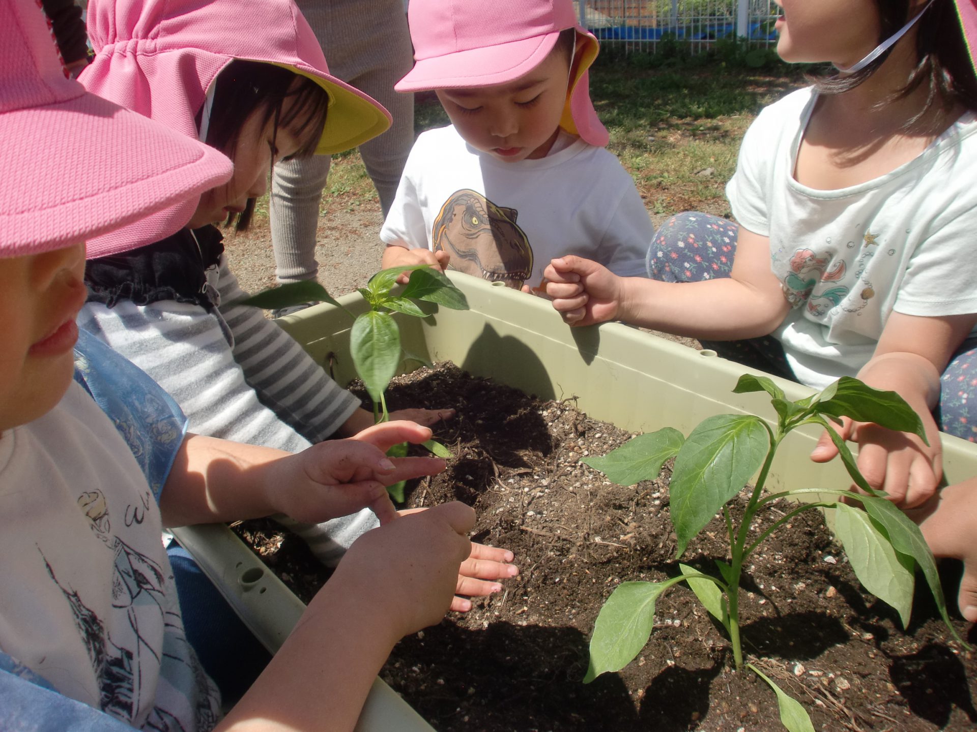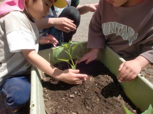 自分が植えた苗に名前をつけてあげる子や「りぼんちゃん心配だなあ」と苗が元気に育つか心配する子もいて、毎日生長を楽しみにして観察してほしいと感じました。また、水やりや草取りなど野菜の世話を通して、食べ物を大切にする気持ちを育てていきたいです。