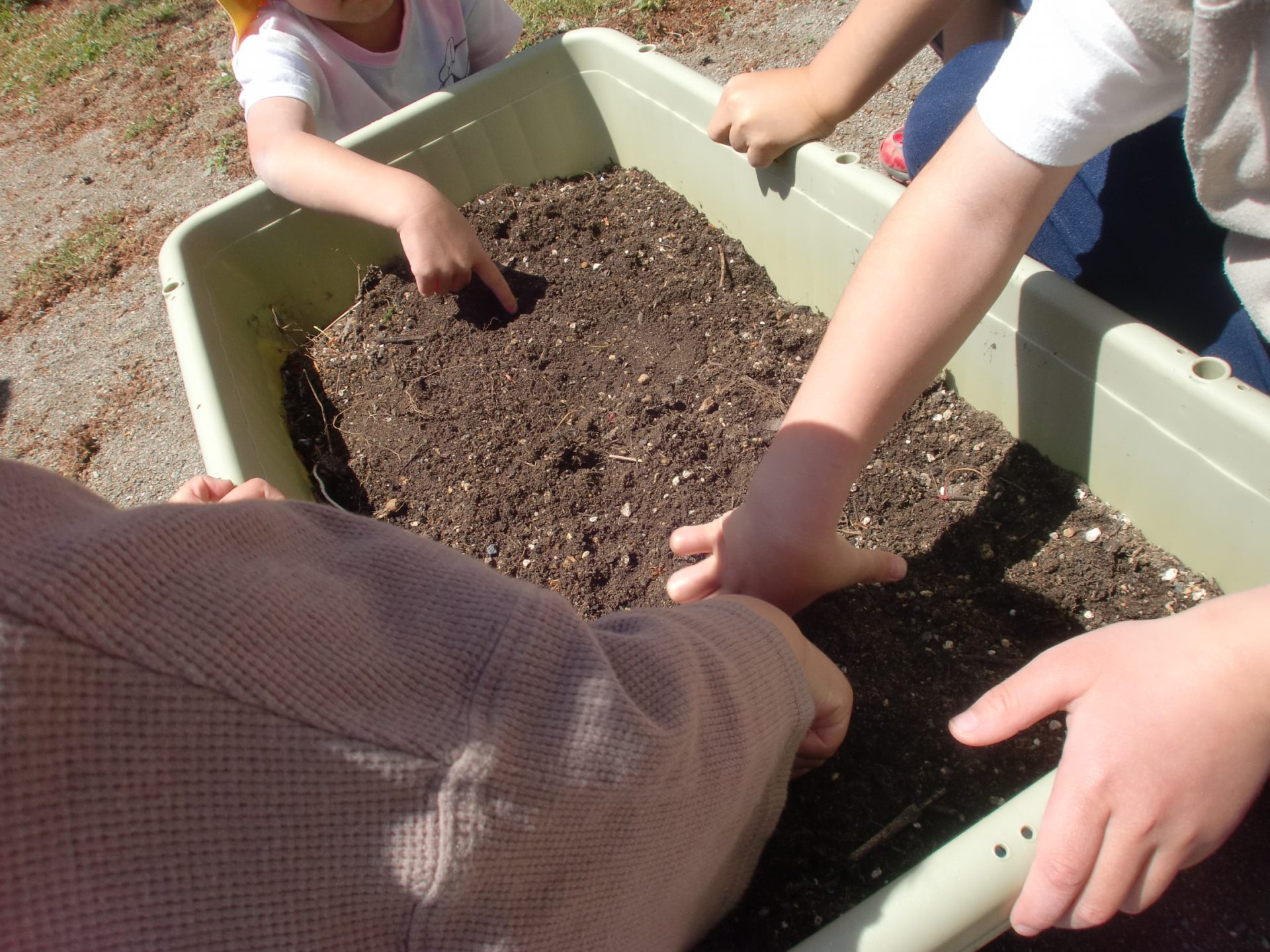 ポットから苗を取ることも「やってみたい!」と子どもたち。「ここを押さえて、、指で押して、、」