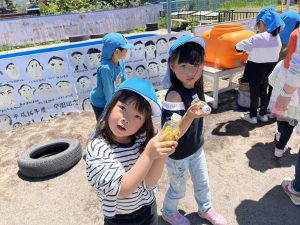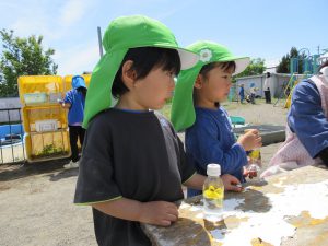 ・園庭の草花・花壇で育てた花・・・それらを使って年長さんが作っていた色水を見て 年中・年少さんもやってみたくなってやり取りが始まりました。どんな草花を使おうか どんな色になるのかな というワクワク感から何色も作ったり、一度作った色に花を足して変化を楽しめていました。作ったあとにジュースやさんごっこをしたり お家の方に見せたいと楽しみにしていたら色が変わって「あれ?」と不思議がったり・・・季節の自然に触れて その時期ならではの植物との出会い・発見をこれからも一緒に楽しんでいきたいと思います。