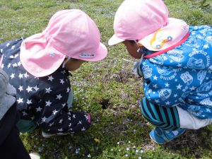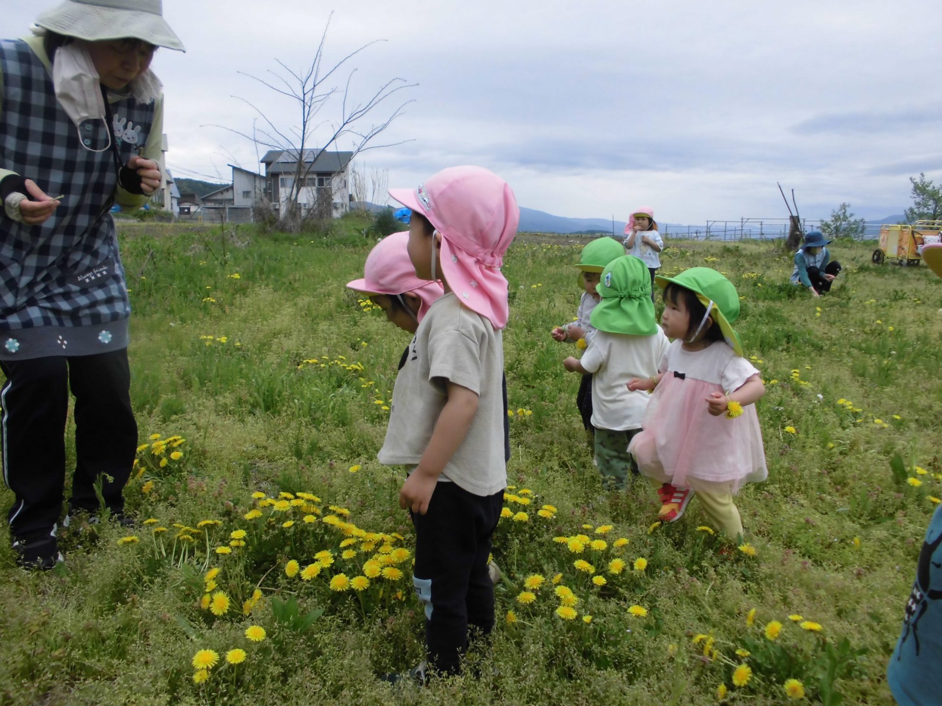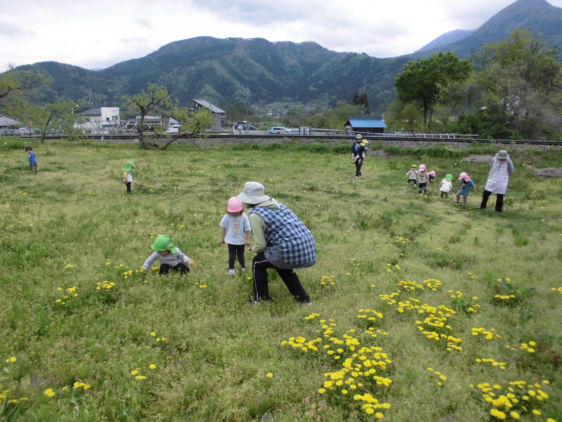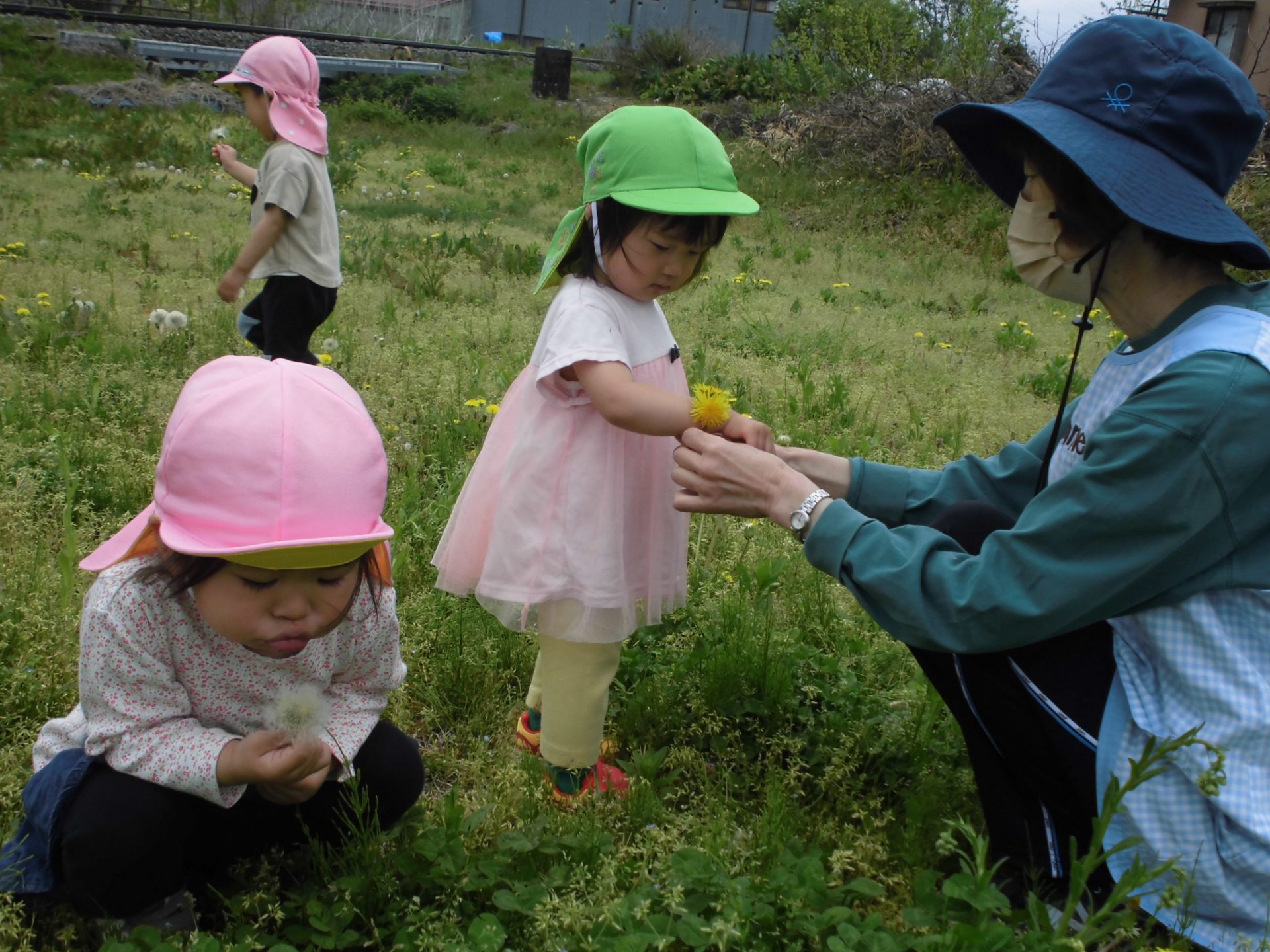 他の場所にお散歩に行ってもシロツメクサを腕時計にしたり花束を作ったりなど、保育者と一緒に遊んだあそびを楽しんだり、思いきり走り回って体を動かす姿などがありました。