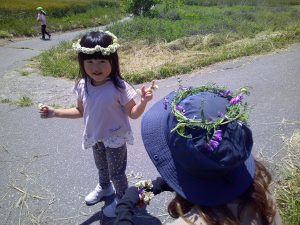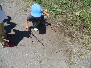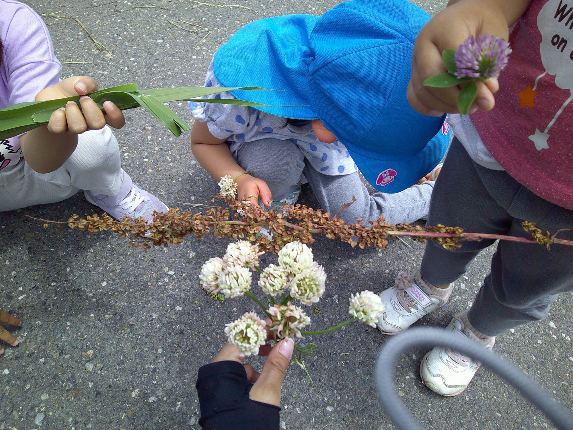 ・土手にはたくさんの花や虫がいました。見つけたときの子ども達の表情はとっても嬉しそう。子どもは発見の天才です。自然のおもしろさ、不思議さに気づけるように関わっていきたいです。