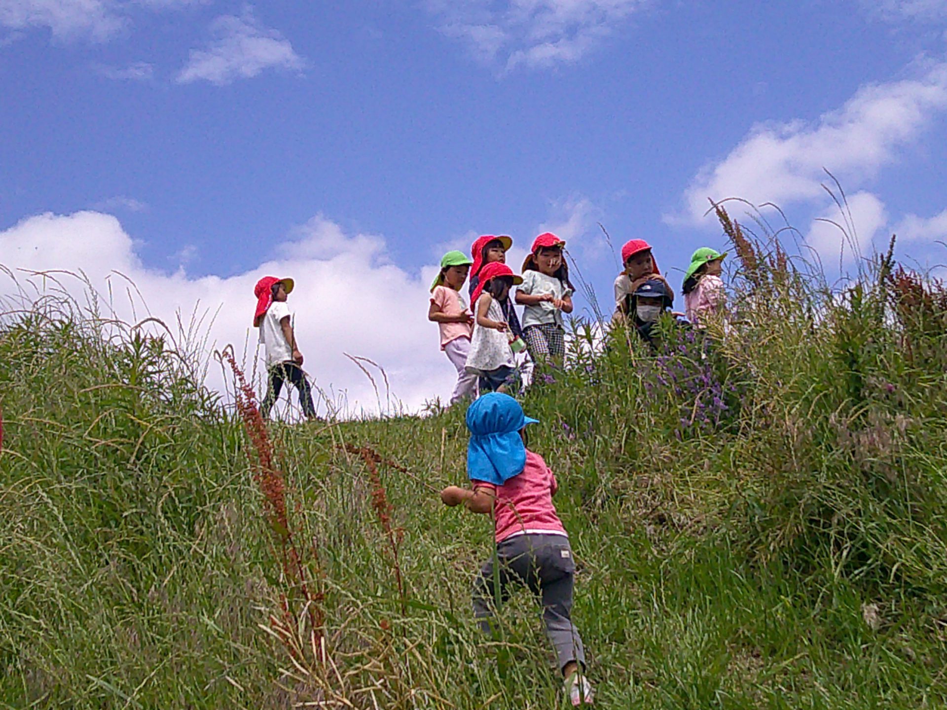 ・広い土手でたくさん体を動かしながら遊べました。普段からサーキットなど運動遊びに力を入れていますが、土手では思い切り直線を走ったり坂を上り下りしながら様々な体の動きが自然とできていました。