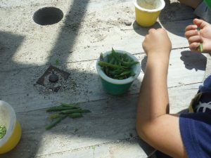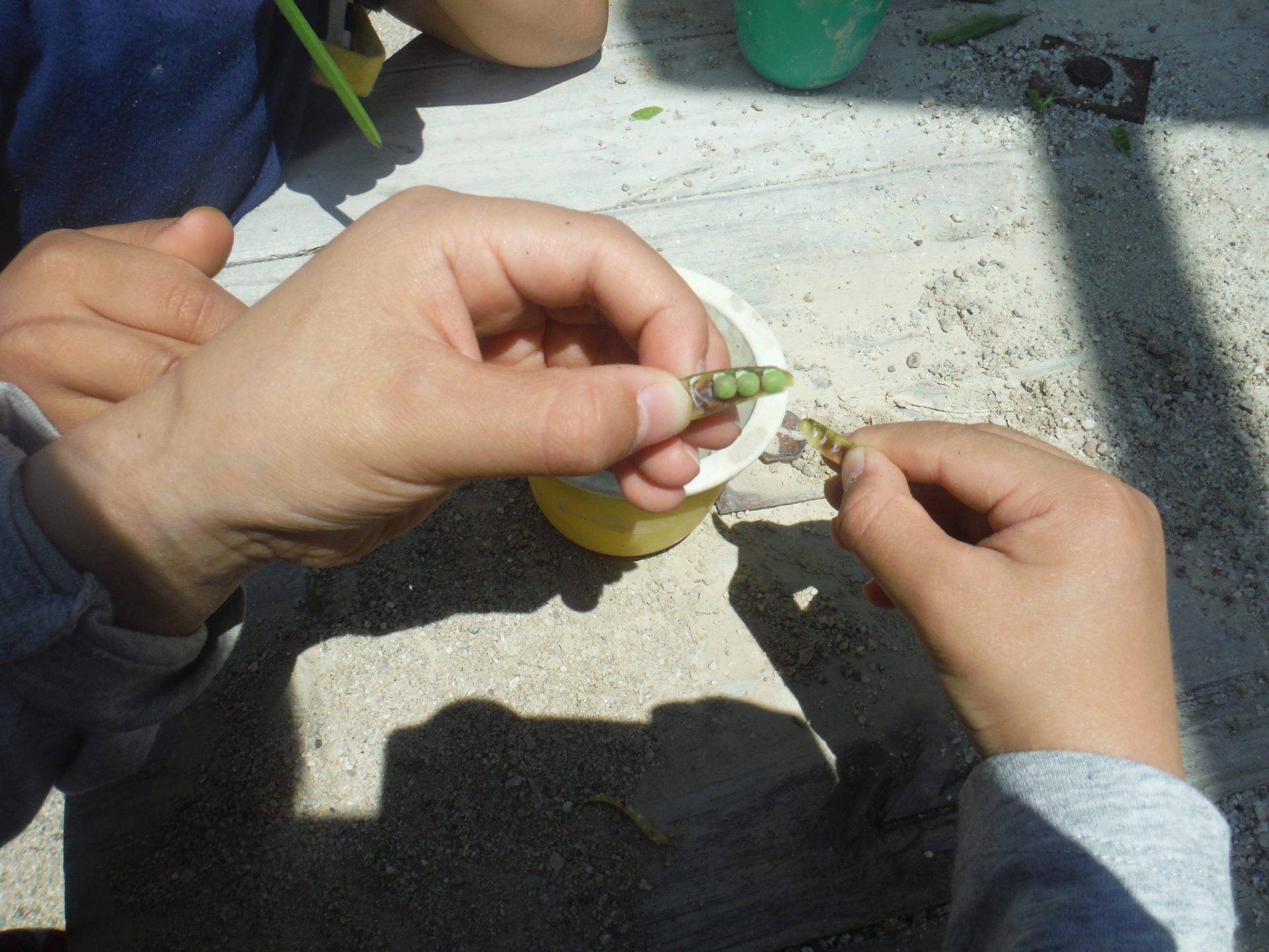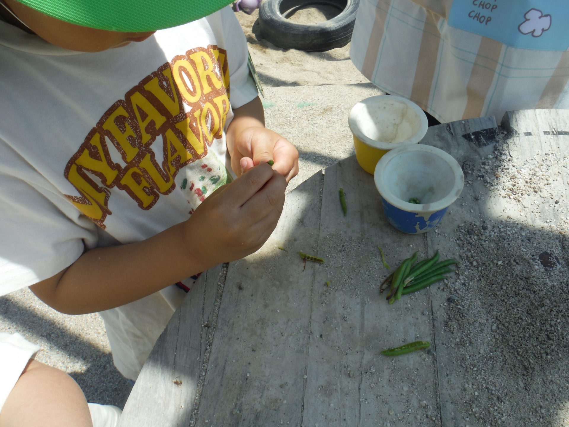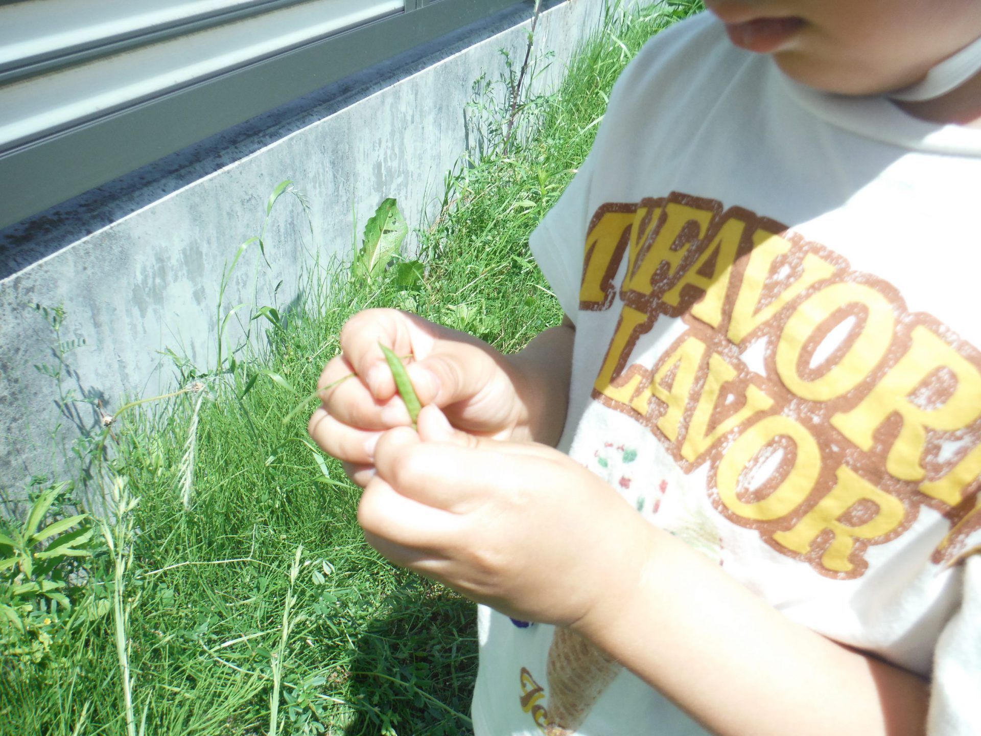 お散歩へ行ったときにカラスノエンドウを見つけ、中に豆が入ってることを知った子どもたち。