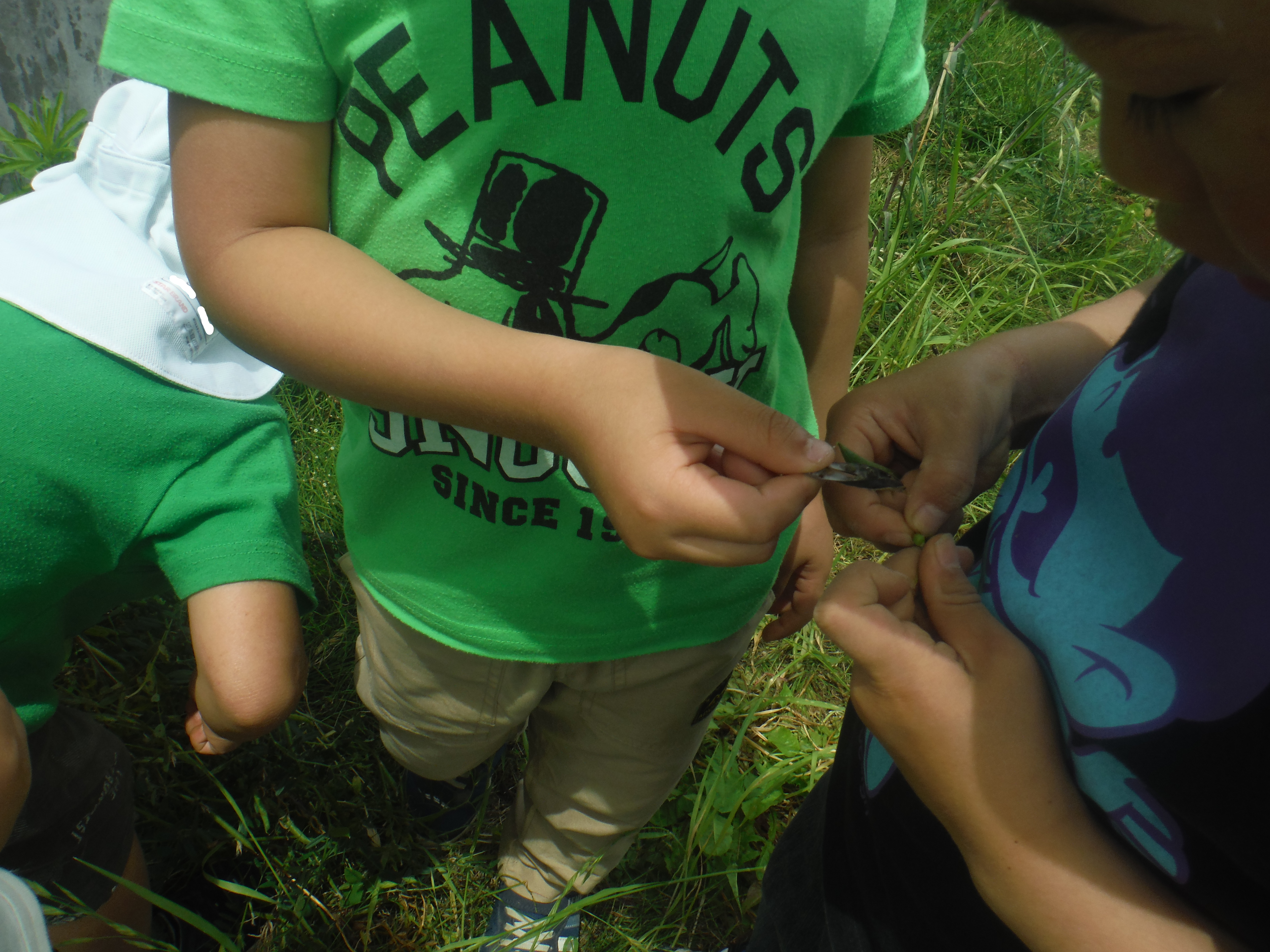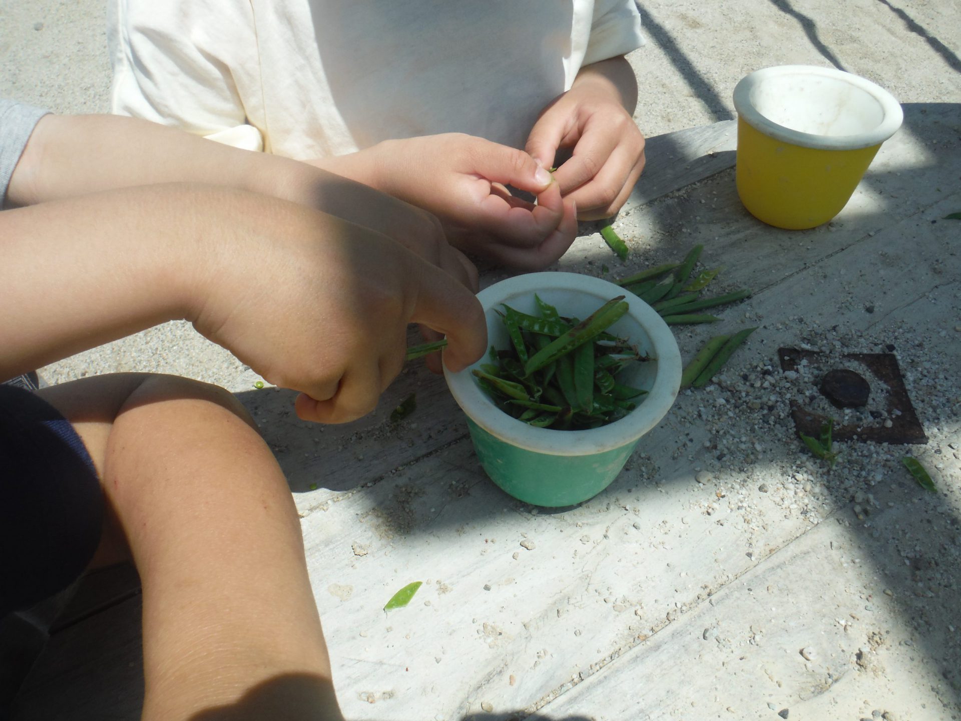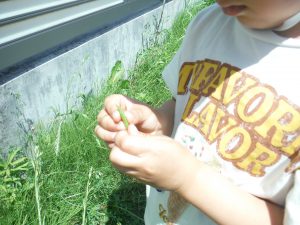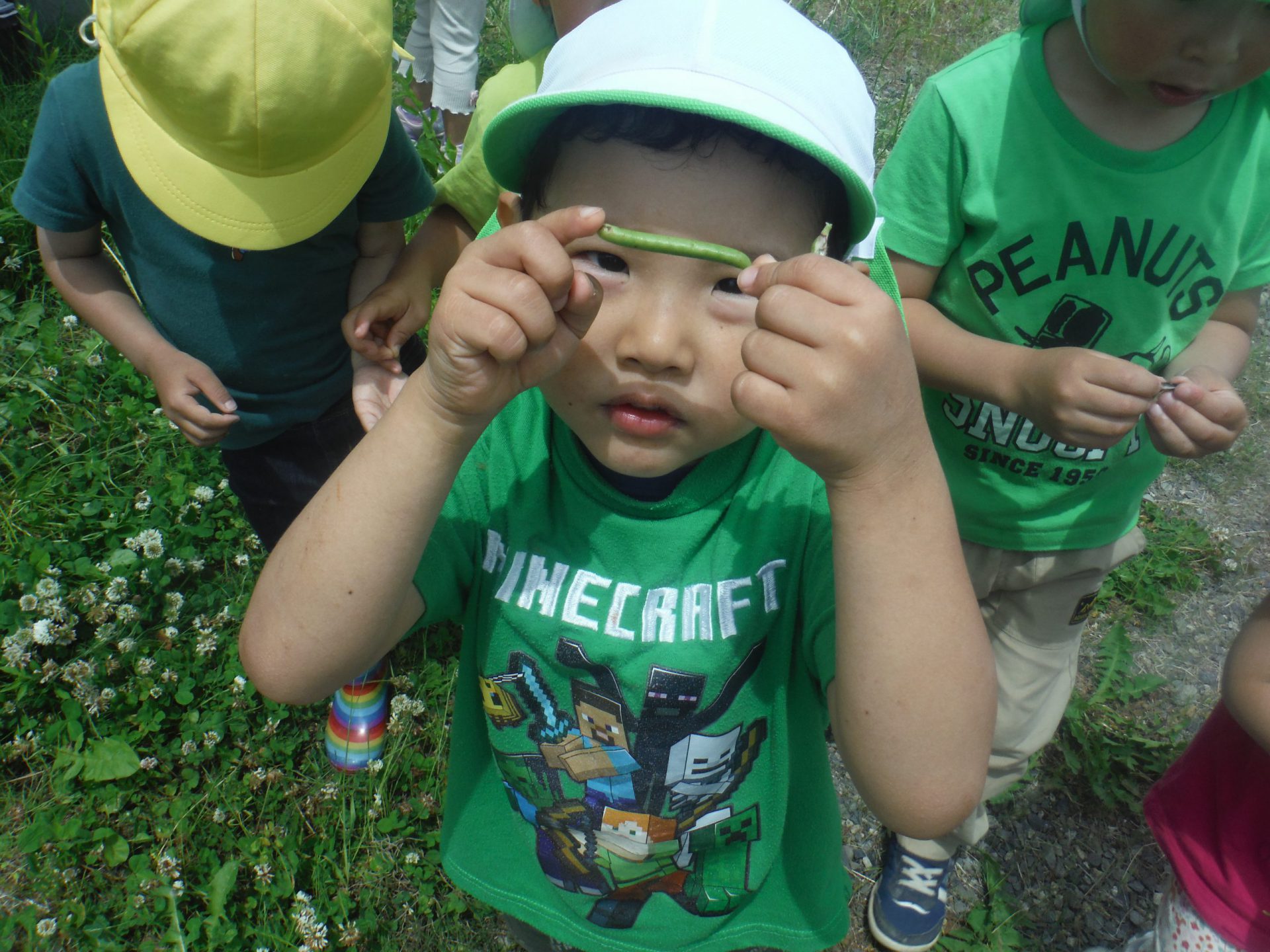 お散歩へ行ったときにカラスノエンドウを見つけ、中に豆が入ってることを知った子どもたち。
