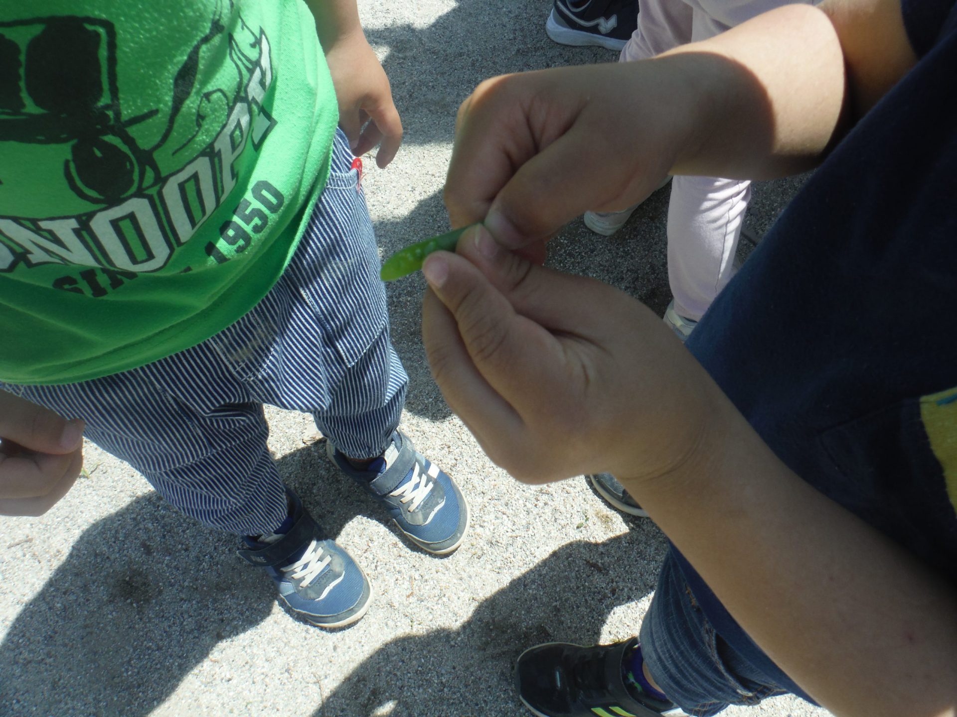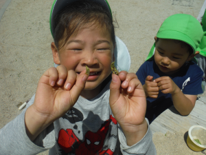 先日、カラスノエンドウの中の豆がはじけ、丸まっているものを発見した子どもたち。