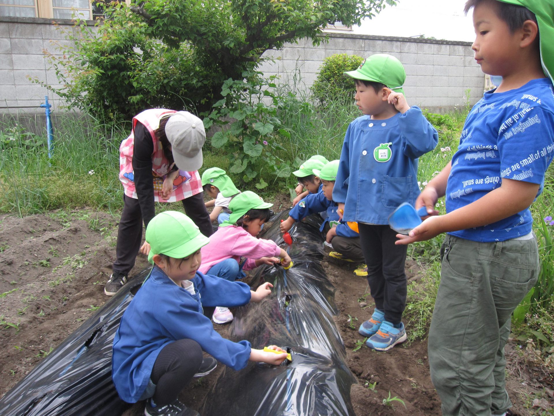「えー、どうだったけ?」と植える向きを確認したり、経験のある年長さんが年少さんに教えたりする姿もありました。