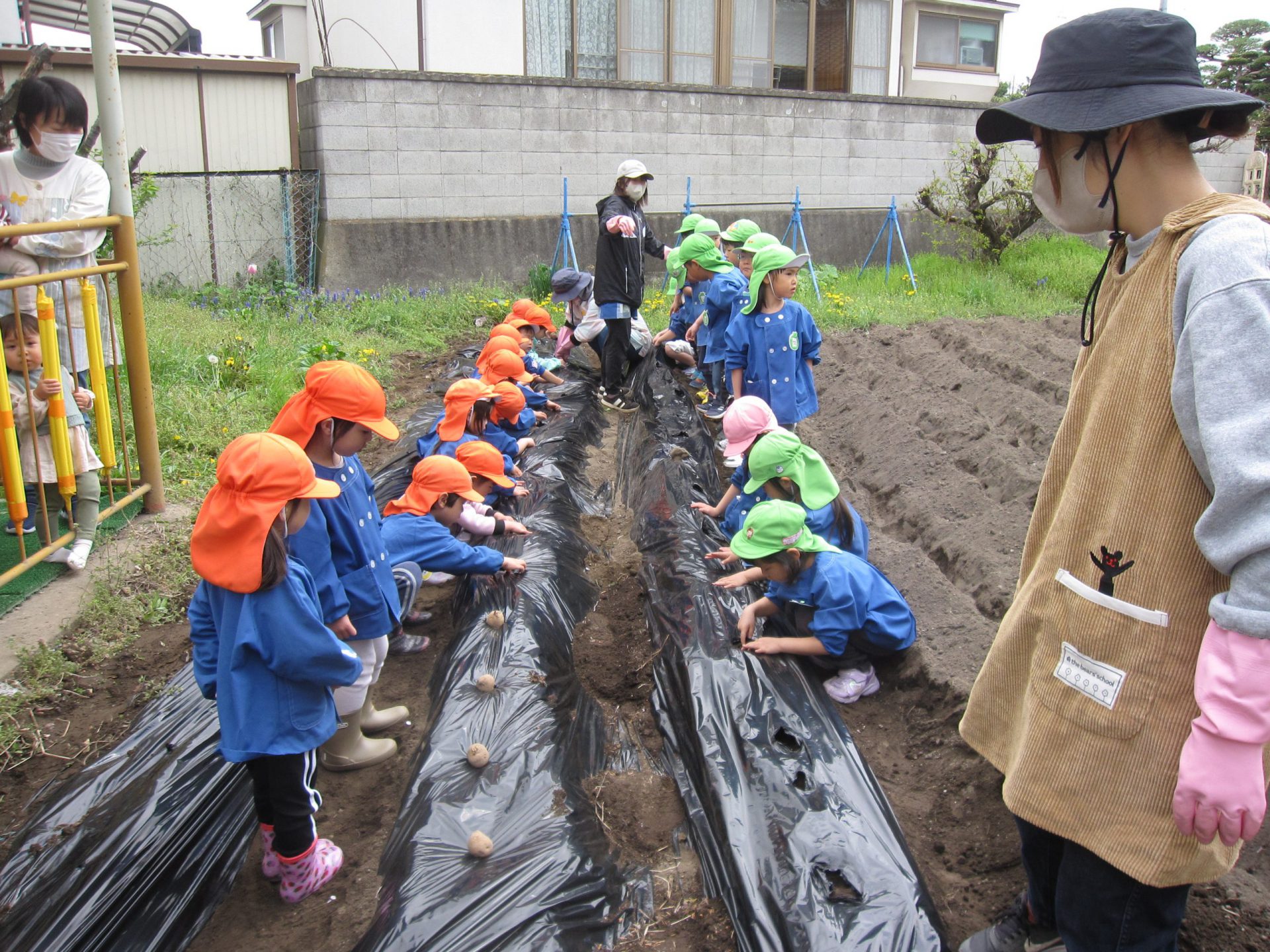 年少さん、年中さん、年長さんが代表して、今年もジャガイモを植えました。