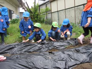 保育士と去年のジャガイモを植えたことを思い出したり、「ジャガイモに芽があって、ジャガイモの芽がおひさまに向かって大きくなれるように、芽を上にして植えるんだよ」とみんなで確認したりして植えました。