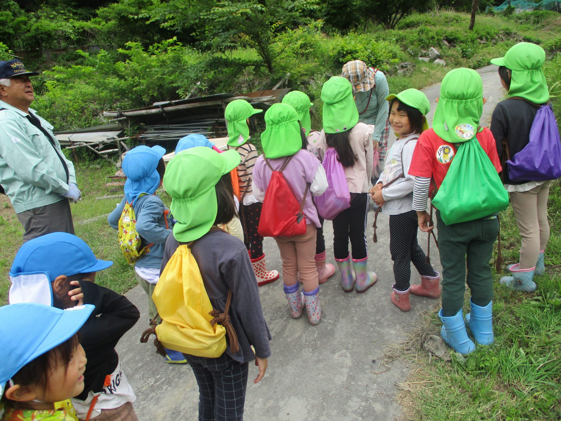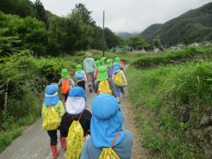 たけのこいっぱい採れるかなと、ワクワクしながら歩く子どもたち。
