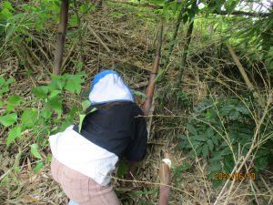 とても急な斜面!長く伸びた竹をつかみ、足を踏ん張りながら慎重に下っていきます。