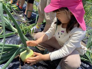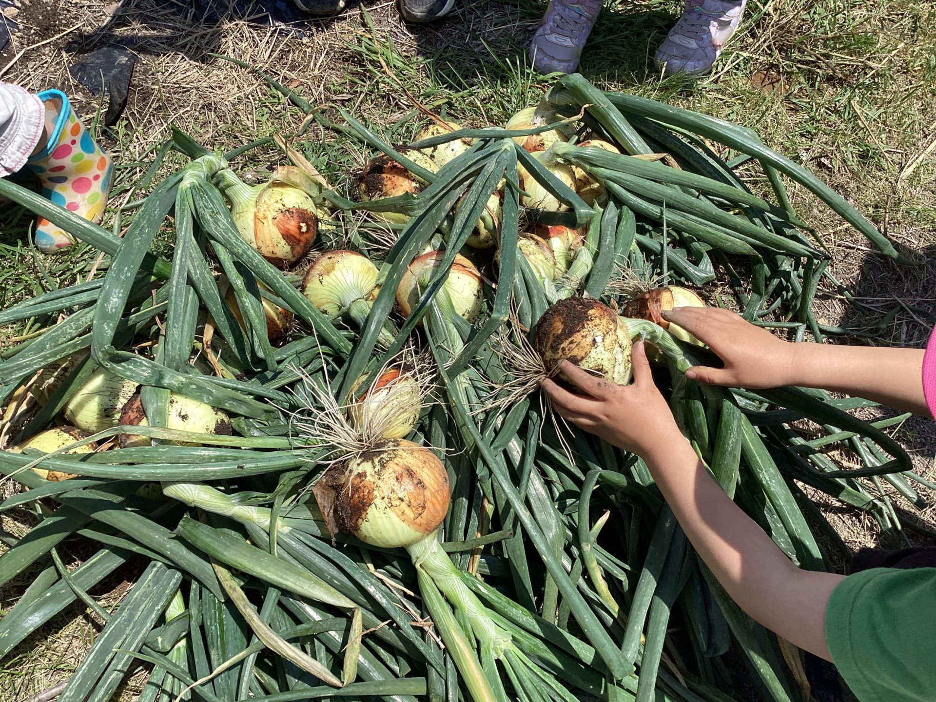 土の中で大きくなった玉ねぎを確認。土をやさしく掘って収穫しました。