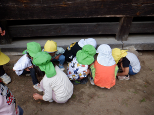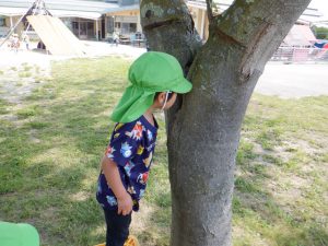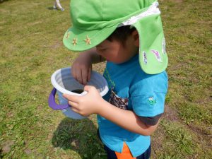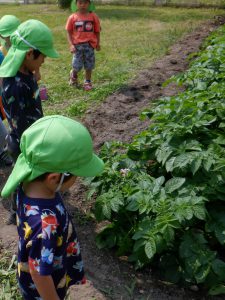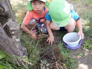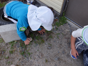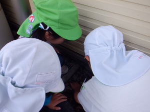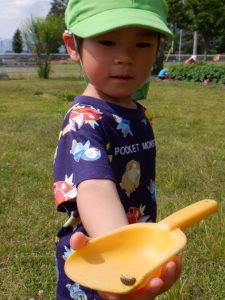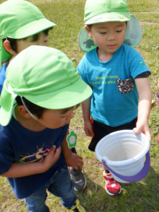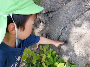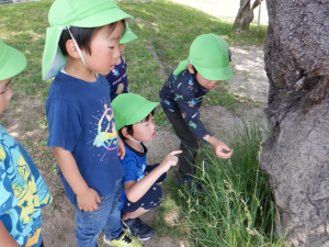 クラスで読んでいる絵本や紙芝居や図鑑などから得た知識を実際に自然の中に出て発見、観察、体験へと繋げ好奇心や探究心へと膨らませている子供達。友達同士会話も弾み夢中になれる姿はとても大切なことだと思います。それと同時に人はもちろん、虫や動物、植物などにもたくさんの命があることをこの機会を通して伝えて行きたいと思います。