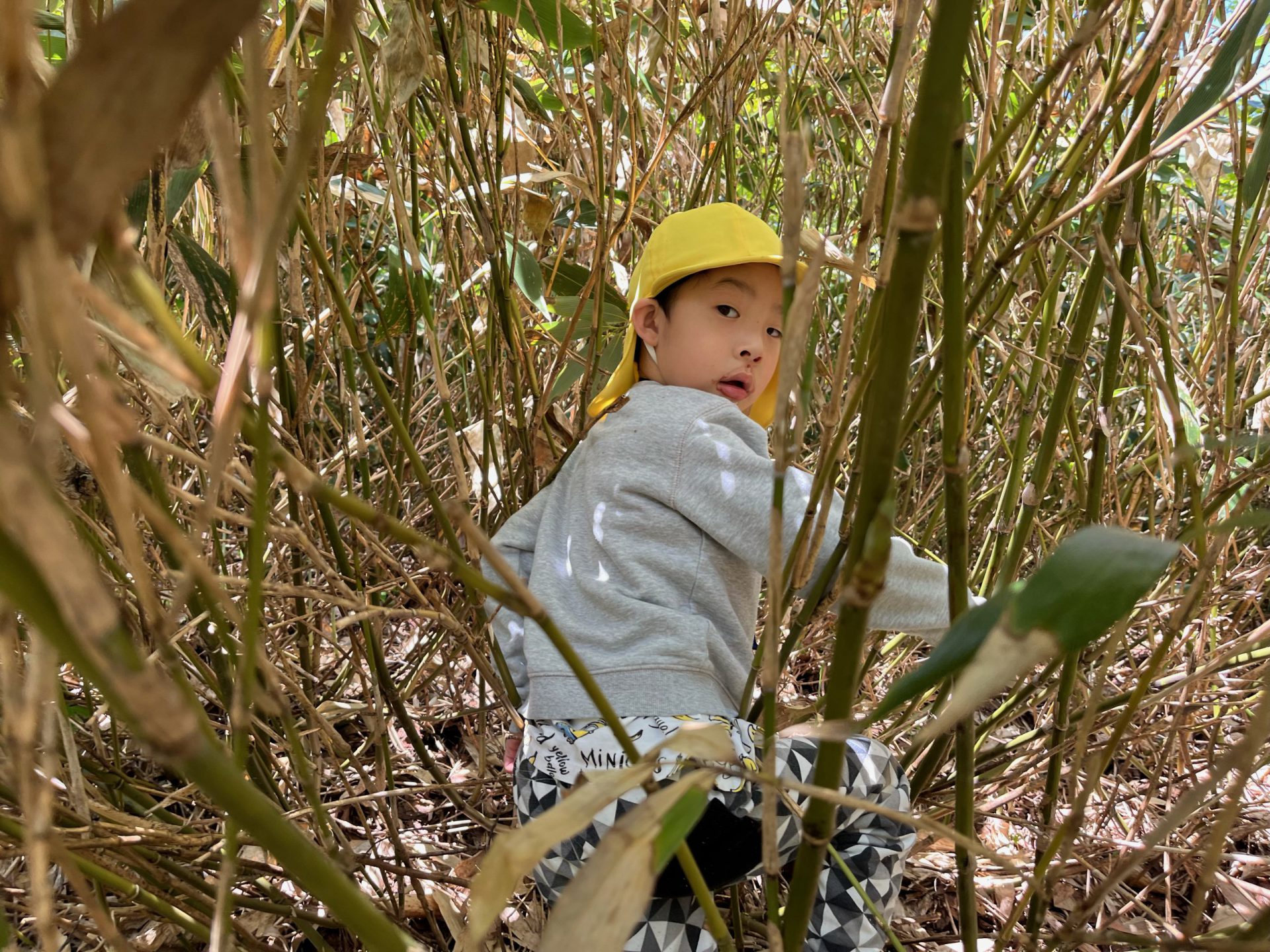 竹やぶの中にたけのこがあることを聞き、こどもから「入りたい!」と言っていたので保育士と一緒に顔などに気を付けて竹やぶに入ってみました。「探検みたいでとても楽しい」と言っていました。