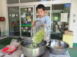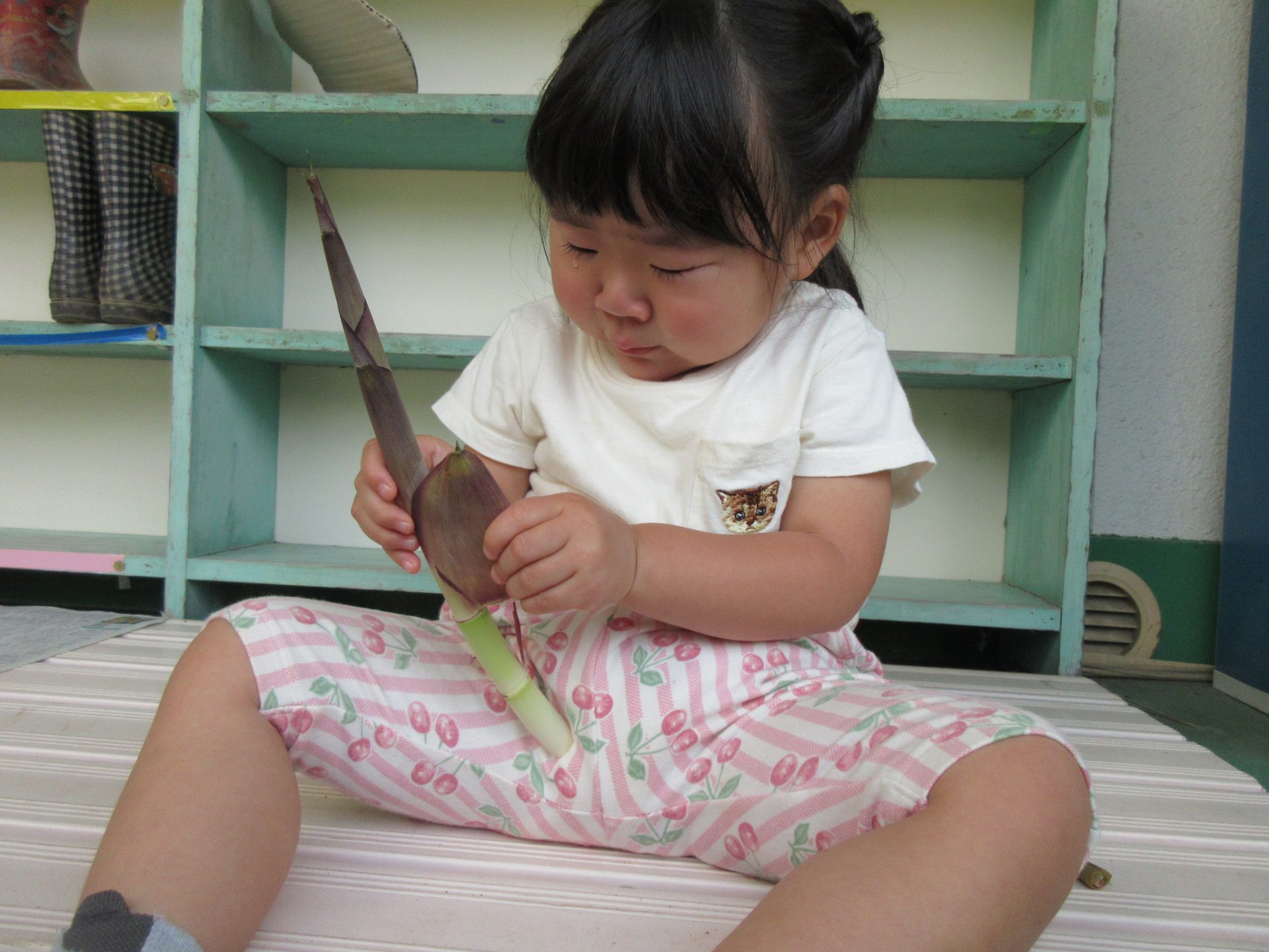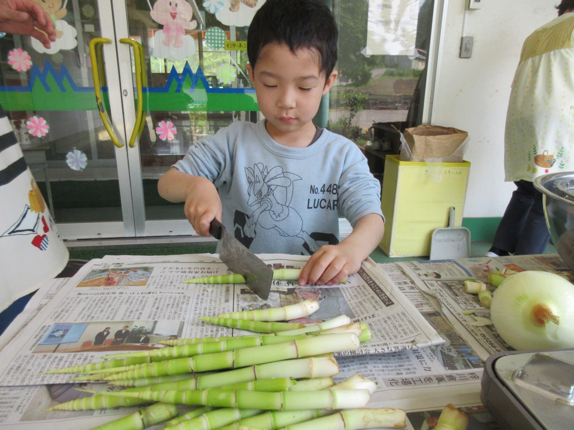次の日は採ってきたたけのこを使ってたけのこ汁を作りました。未満児も一緒にたけのこの皮剥きをしてもらいました。未満児の力でも簡単に剥けるのできれいに剥けたときはとてもうれしそうでした。