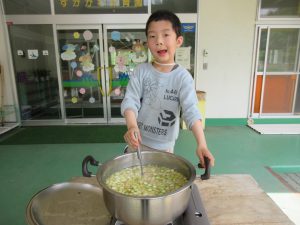 年長さんには、包丁を使ってたけのこを切ってもらったり、たけのこ汁を混ぜてもらったりしてクッキングをしました。お味噌の匂いがしてきて、食べるのがとても楽しみ!!