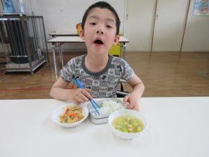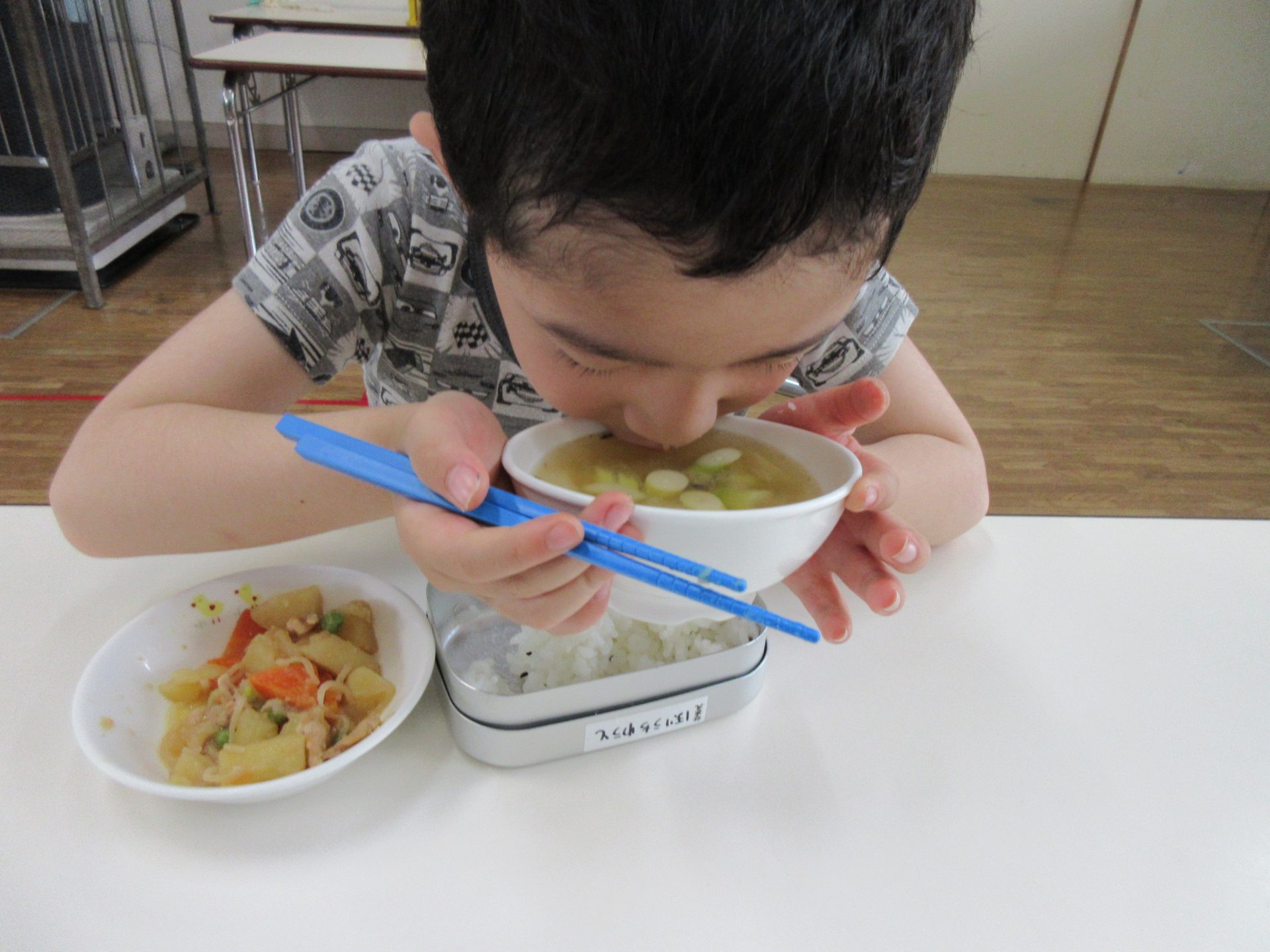 給食の時間に、クッキングしたたけのこ汁をみんなで食べました。とてもおいしかったようで何回もおかわりしてよく食べていました。