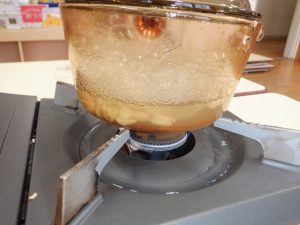 一晩水につけた「大豆」を透明な鍋に入れて煮ていきます。