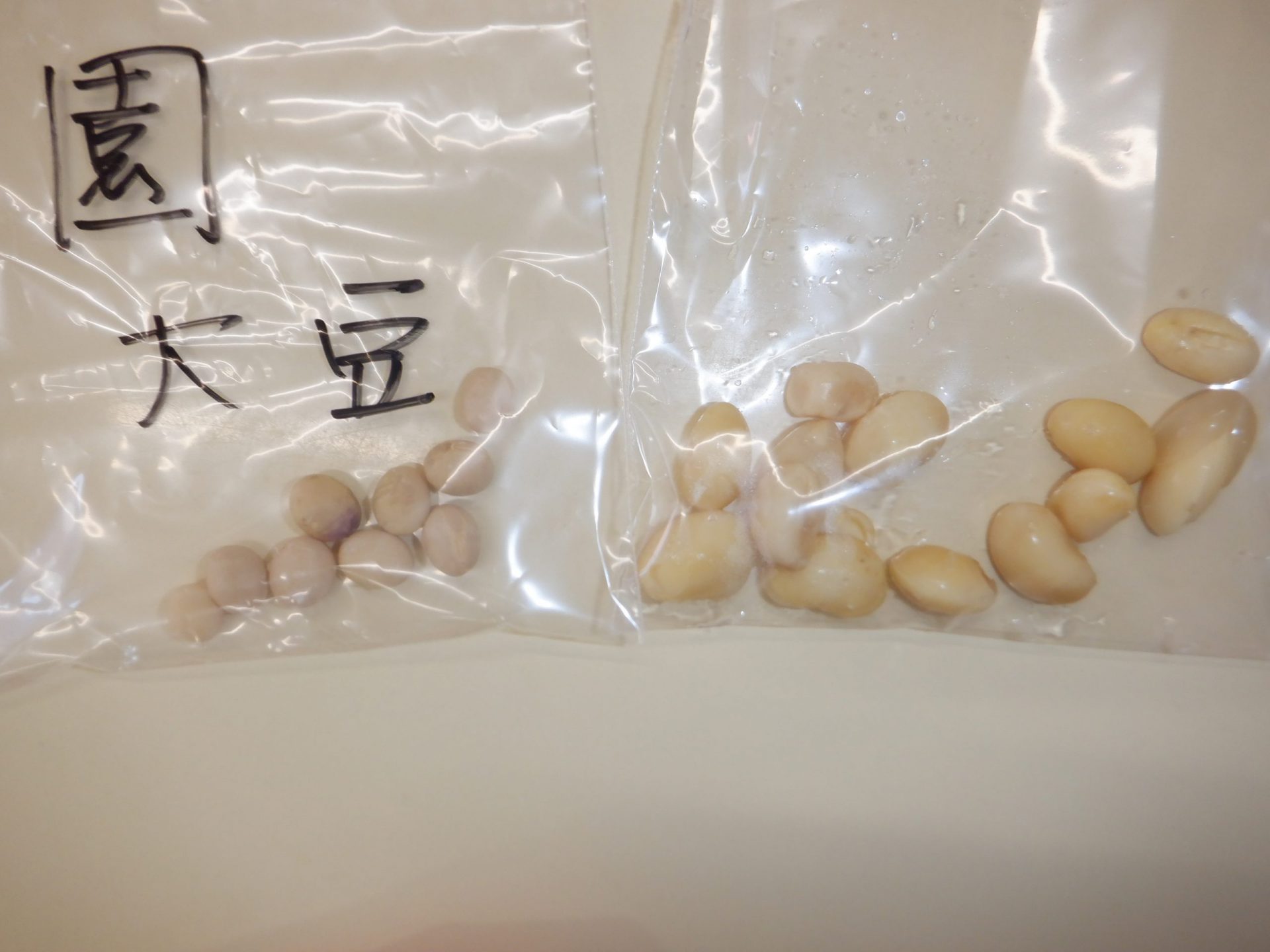 一晩水につけた大豆・・・「わー、おおきくなってる!」