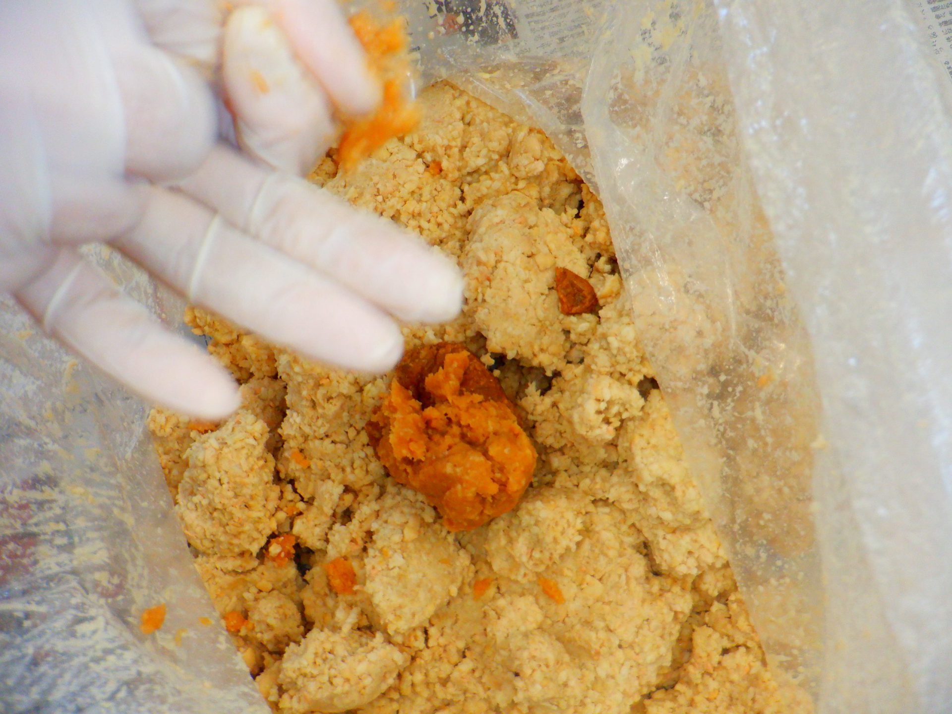 柔らかさを見ながら木下さんが、「大豆の煮汁」を混ぜていき、ちょうどいい感じになるまで混ぜました。