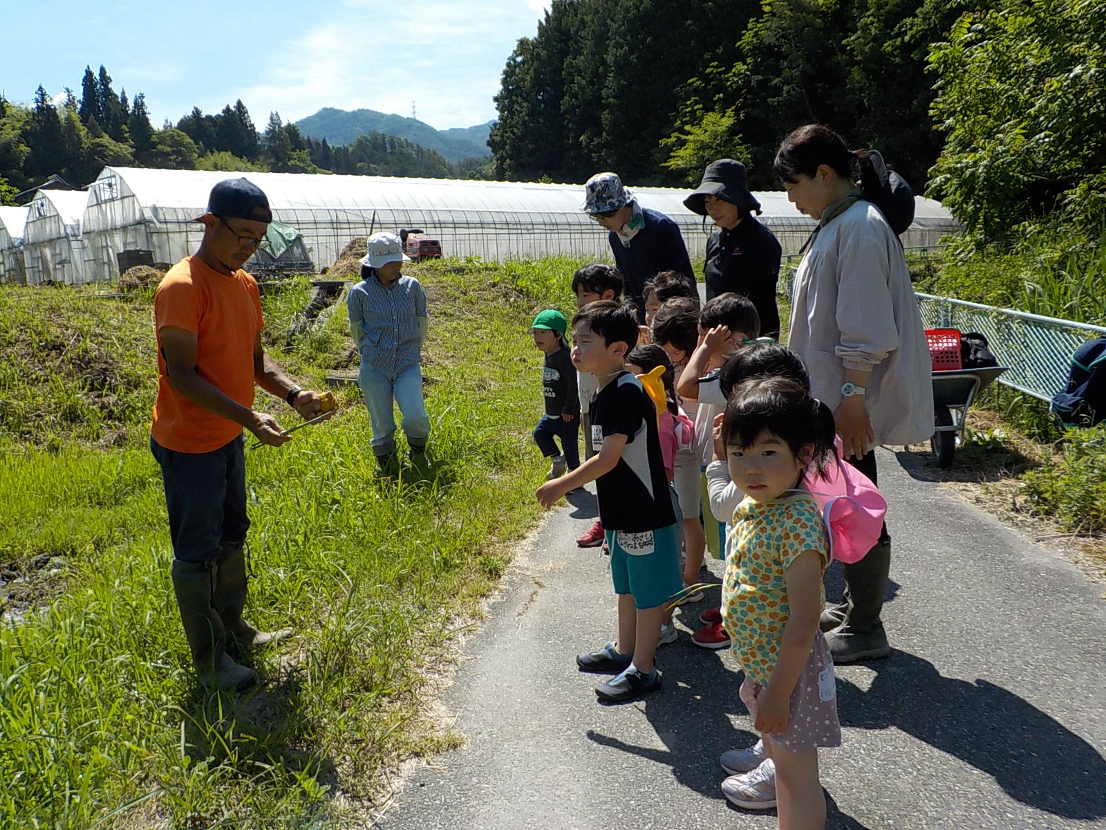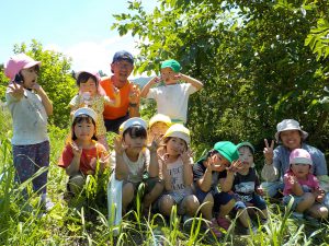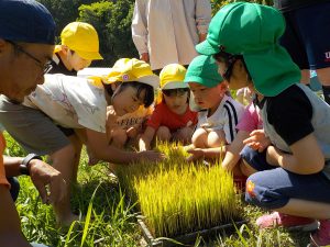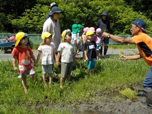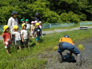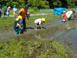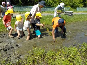 お田植え経験3年目となる年長児が「今年は自分たちが植えるんだ!」と張り切ります。そんな年長児を年中、年少時はお手伝いをしながら応援します。きっと年長児の姿を見て「次は自分たちがやるんだー」と受け継がれていくことと思います。