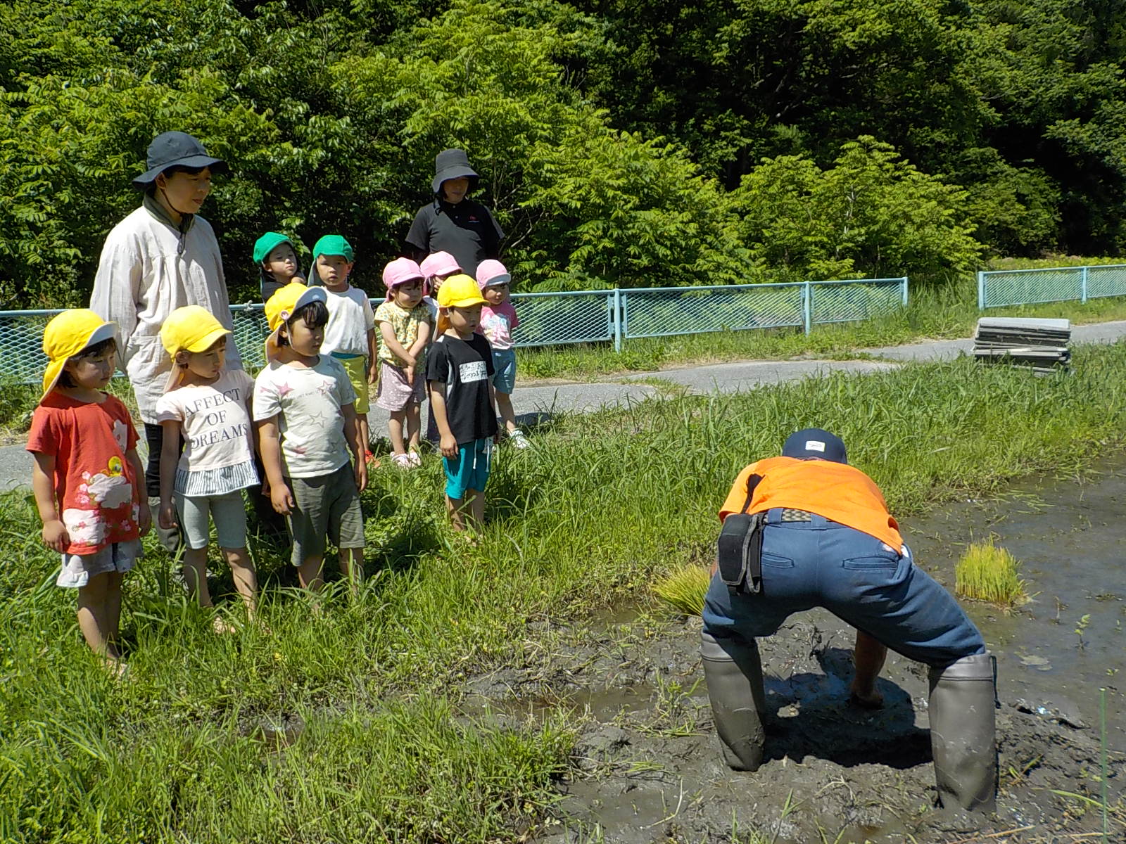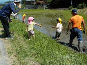 お田植えの経験も3年目、年長さんががんばりました。