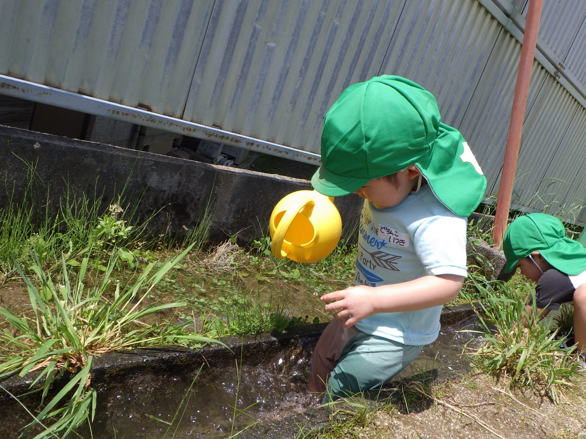 上郷西保育園は近隣の田んぼで利用されている井水を引きこむことができ、その豊富な水資源を活用して、畑の水やりや泥水遊びを楽しんでいます。