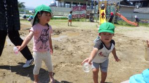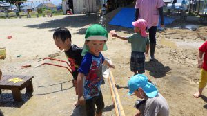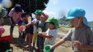気温が高いある日、保育士が井水をポンプで組み上げて穴あきホースにつなぐとたくさんのお友だちが集まってきて、噴水のように高く上がる水に触れたり、”水のトンネル”をくぐったりしはじめました。