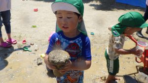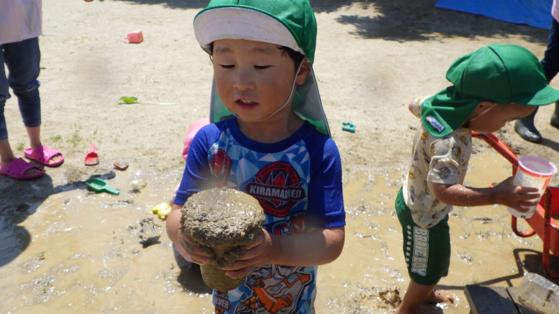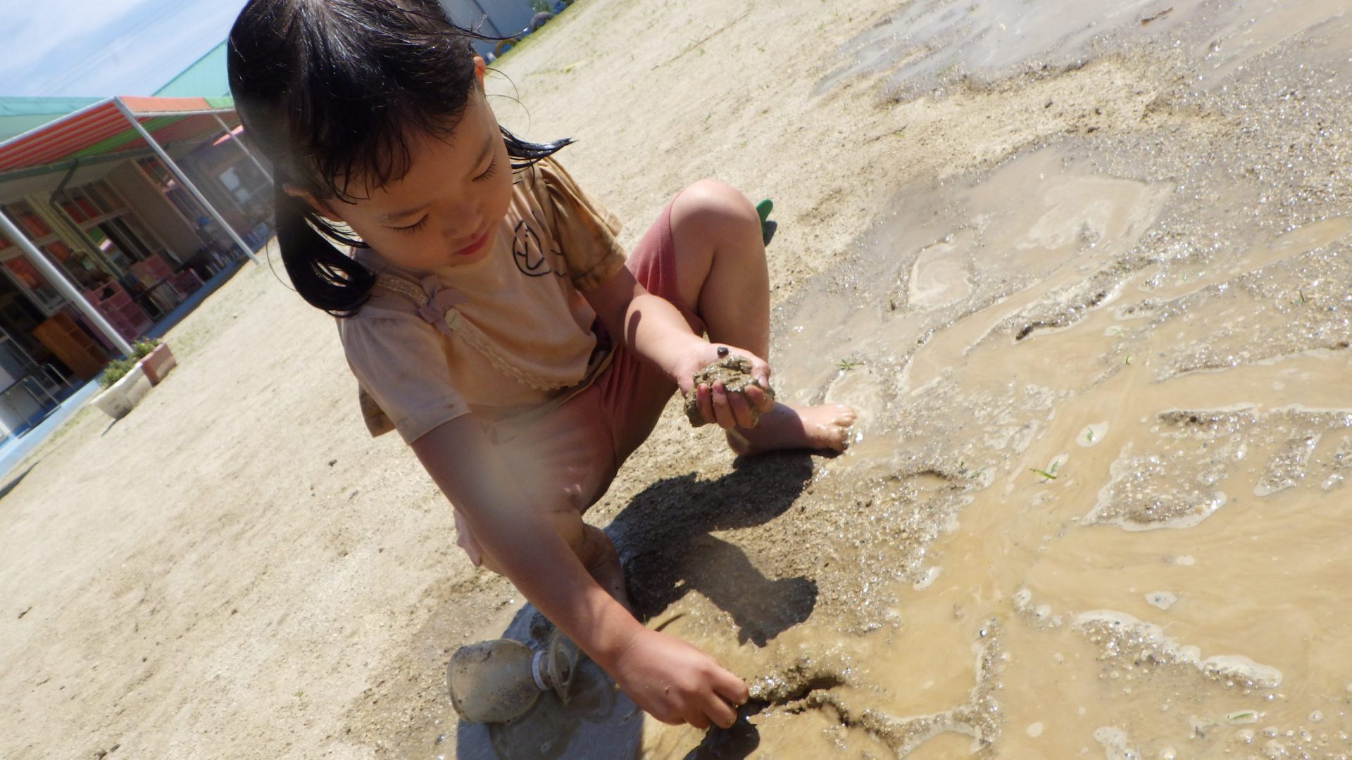 気がつくと園庭の砂と水が混ざって大きな水たまりができていました。水たまりに足を入れたり、とろとろになったを泥触ったり、泥でおままごとをしたりして遊びました。