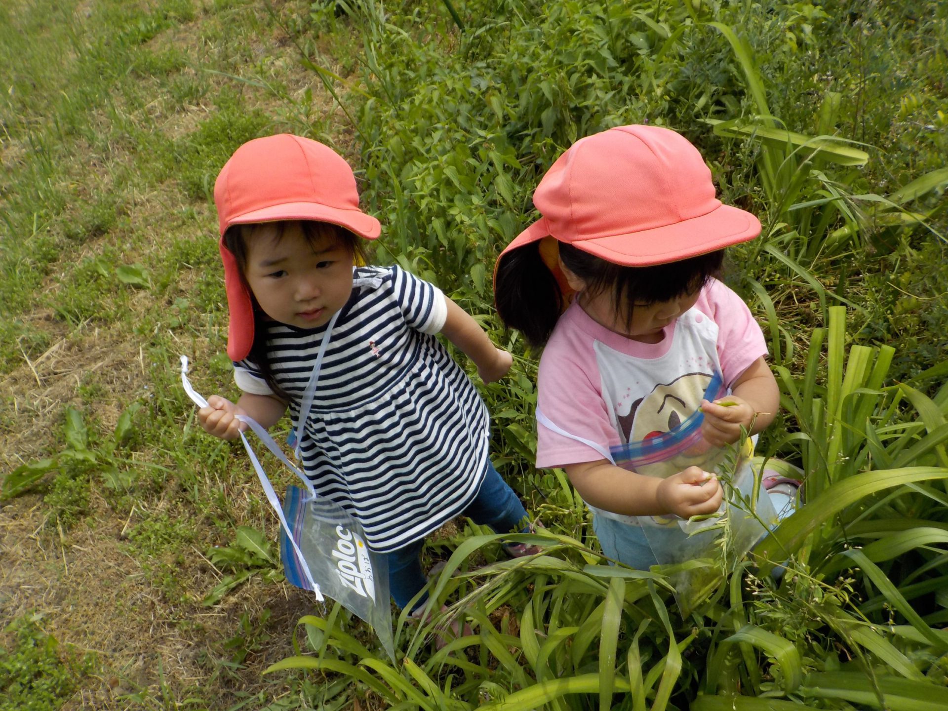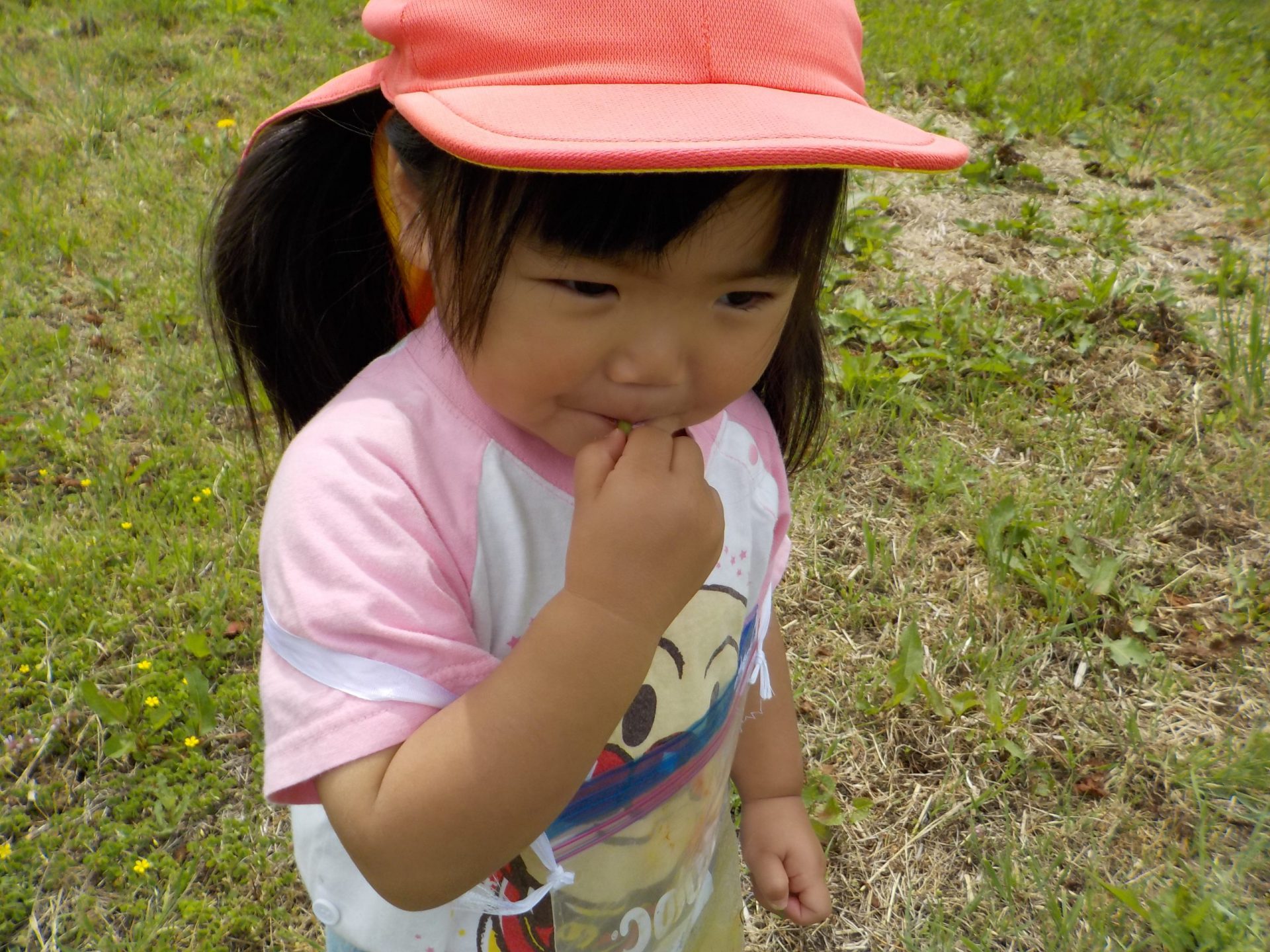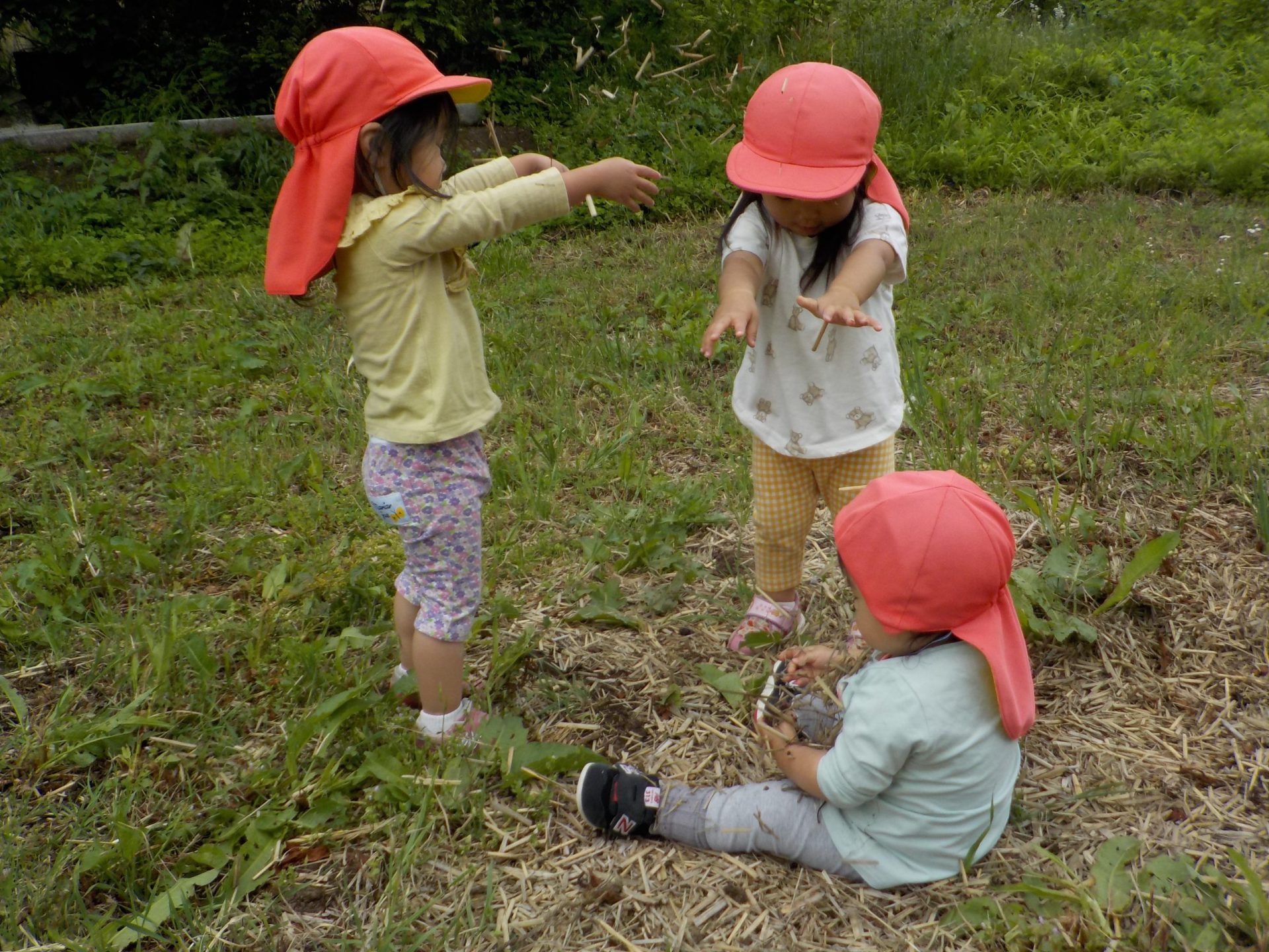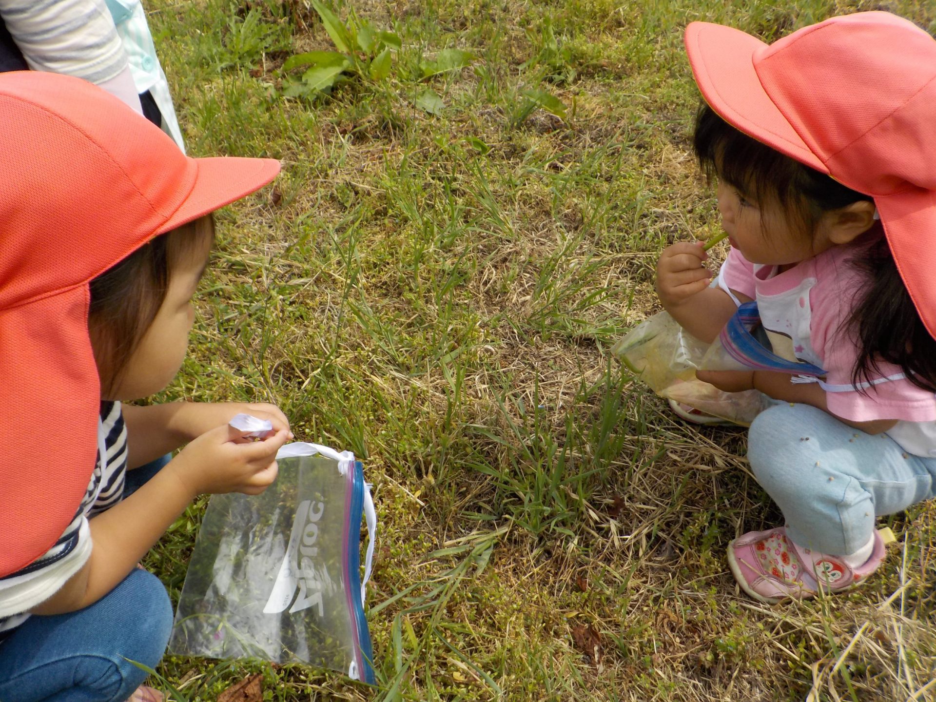 見ていた友達に「ふきたい?いいよ」と聞いて草むらの中カラスのエンドウ豆を探しに行く子や