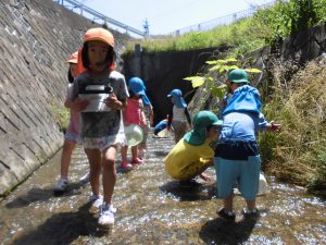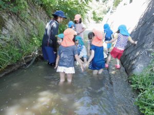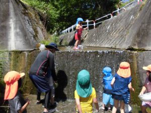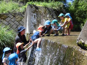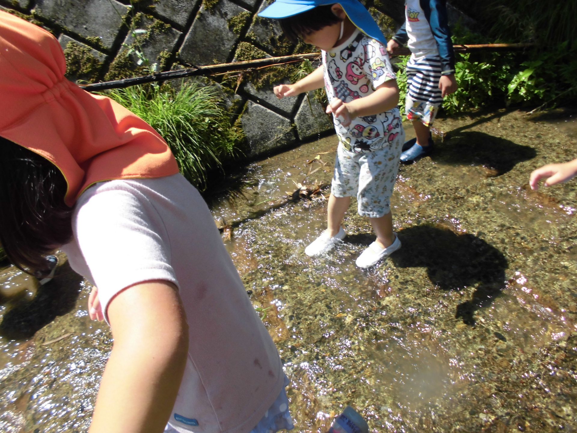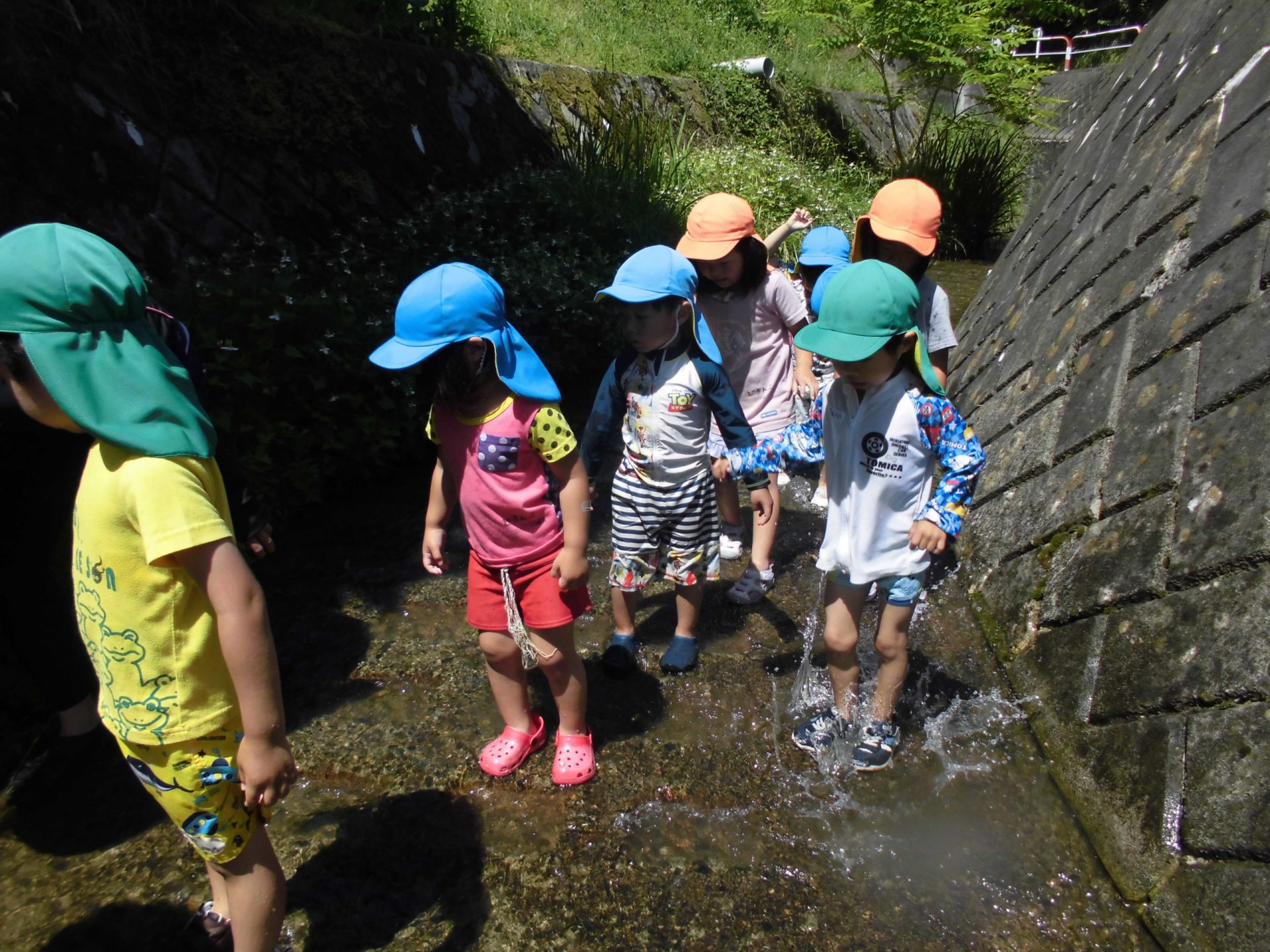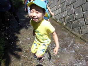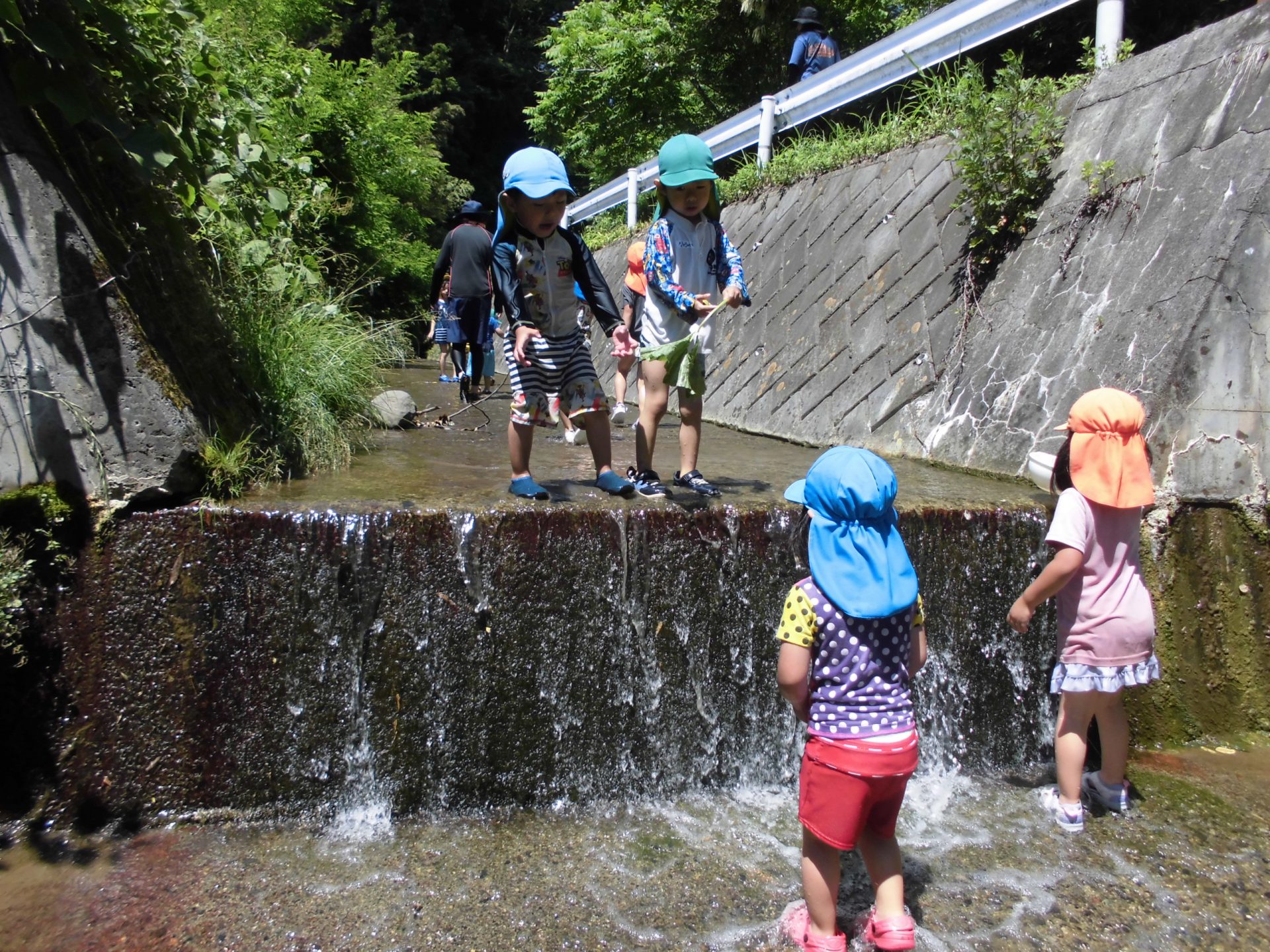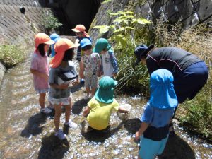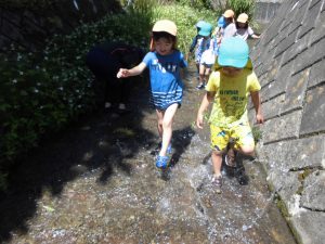 4月から、よく散歩で通りかかり「暑くなったらいこうね」と言っていたので、念願の川遊びに子どもたちは楽しみにしていました。一昨日にゲリラ豪雨があったので「どうなるかなぁ」と保育士が言っていると「ま、流れが急だったらしょうがないよね」と大人びた反応をする子もいました。でも、今日の天気を見て「本当にいけてよかった」と笑顔で言っていたので、内心心配していたのかなと感じました。