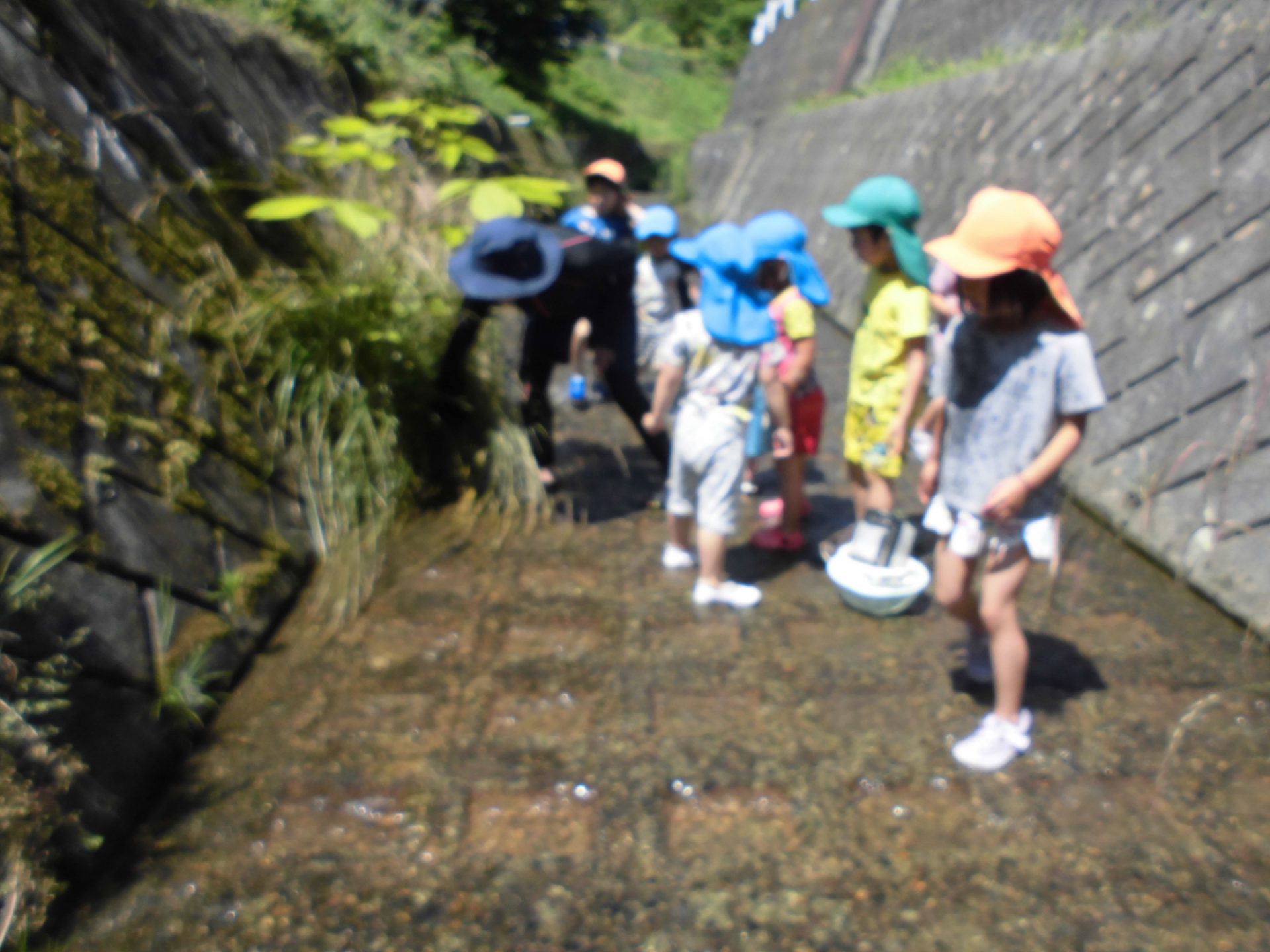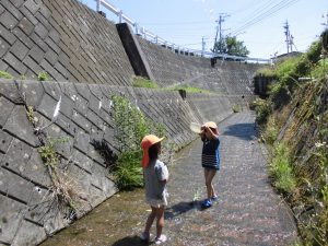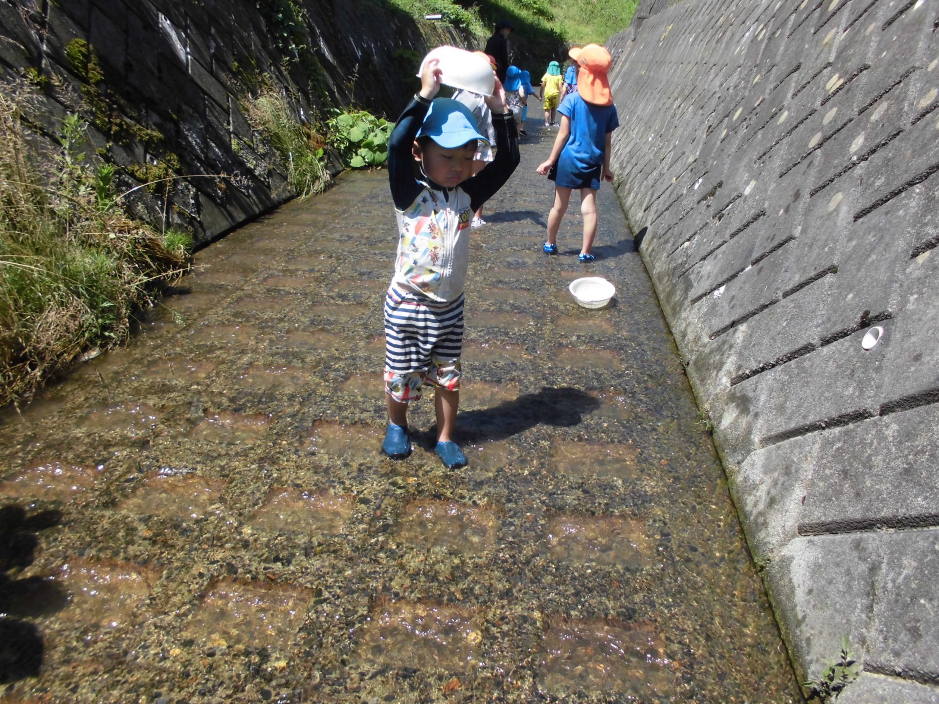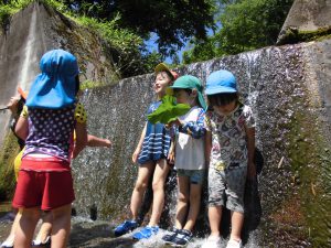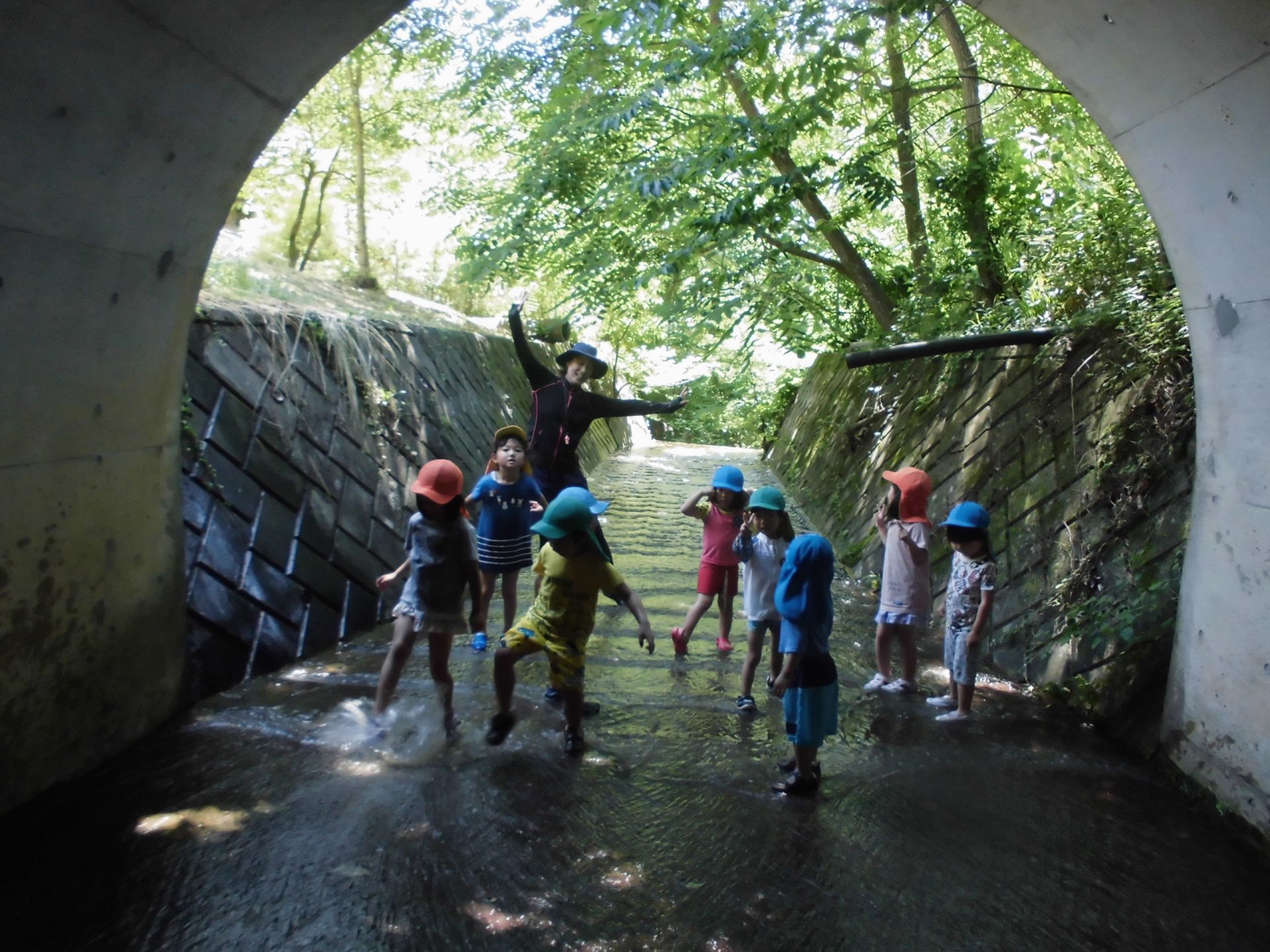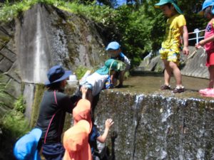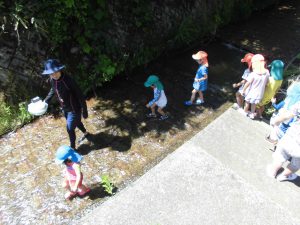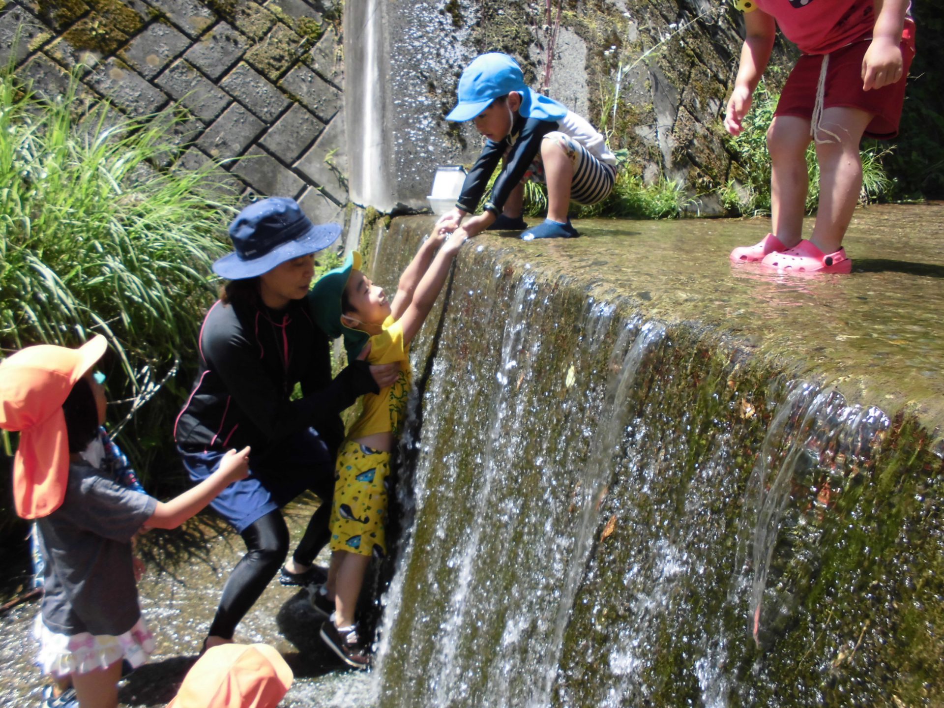 4月から、よく散歩で通りかかり「暑くなったらいこうね」と言っていたので、念願の川遊びに子どもたちは楽しみにしていました。一昨日にゲリラ豪雨があったので「どうなるかなぁ」と保育士が言っていると「ま、流れが急だったらしょうがないよね」と大人びた反応をする子もいました。でも、今日の天気を見て「本当にいけてよかった」と笑顔で言っていたので、内心心配していたのかなと感じました。