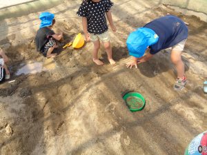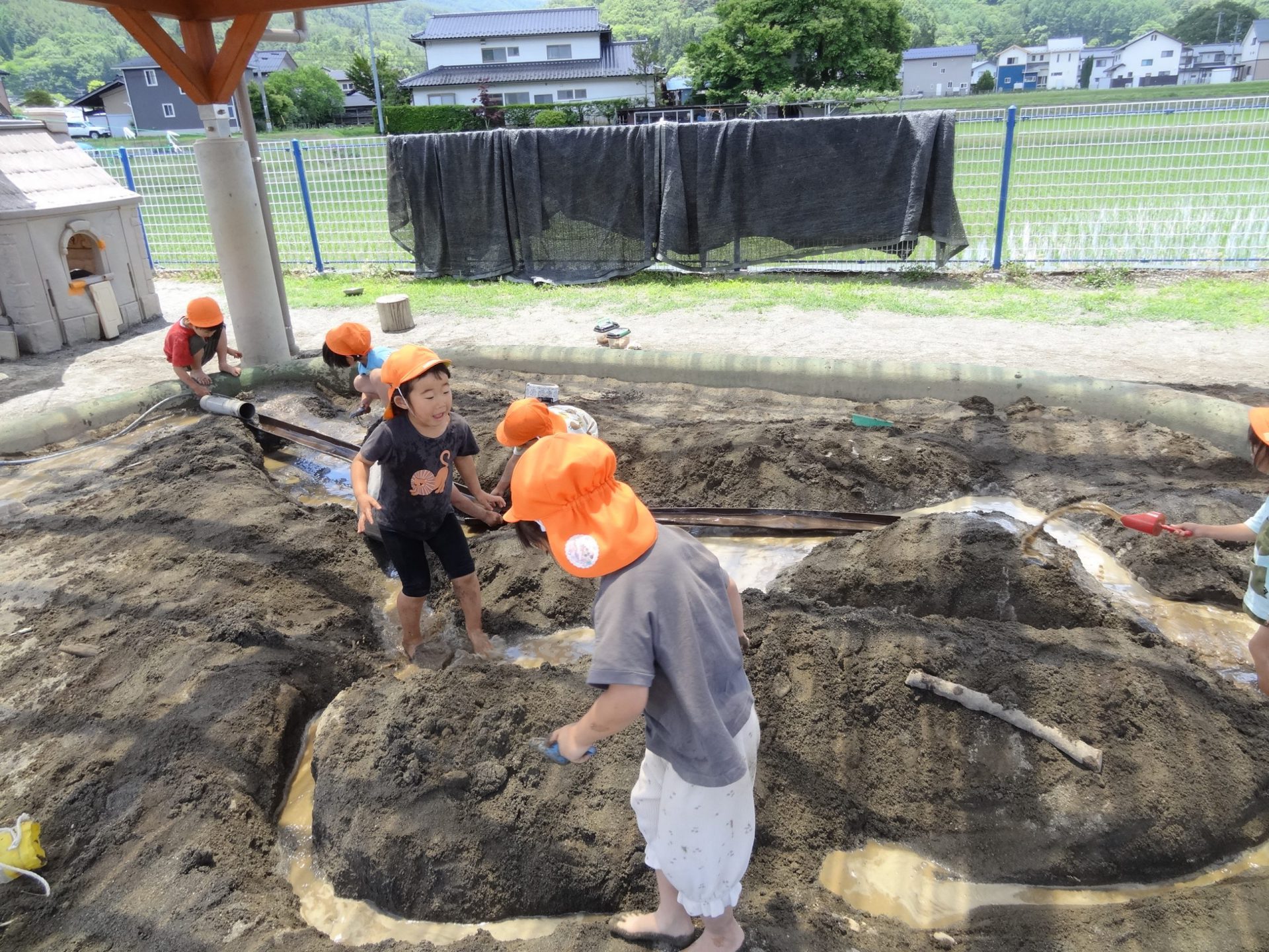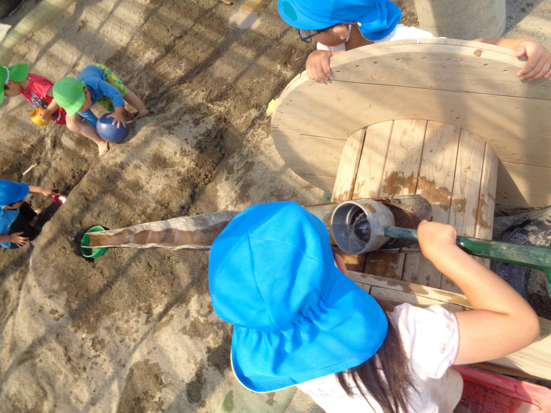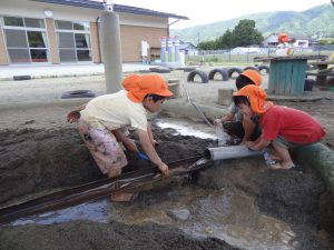こちらは年長さん。昨年度の年長さんが、砂場を掘って水を流し