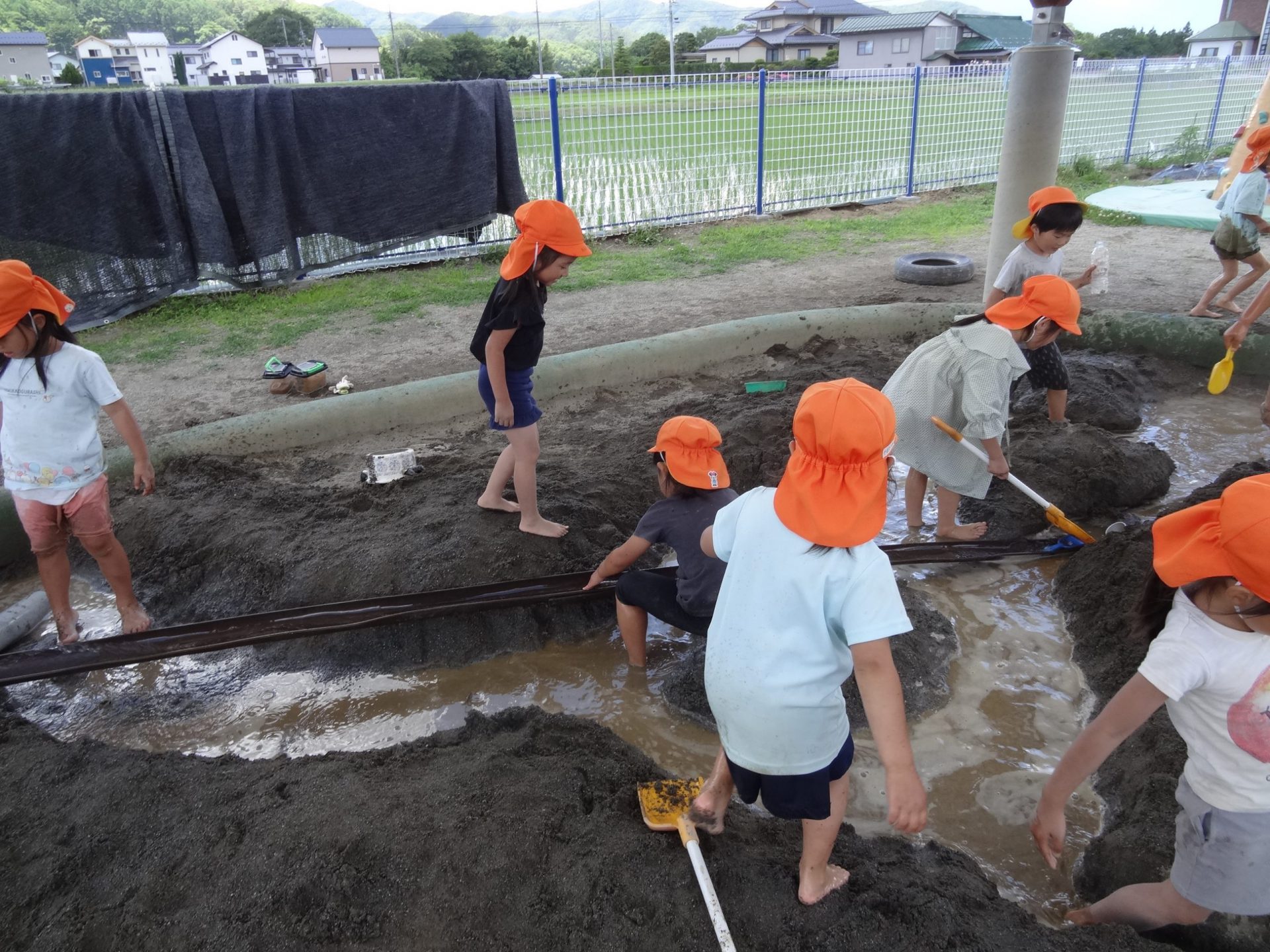 年長さんの様子を見て「やってみよう」と川づくりが始まります。