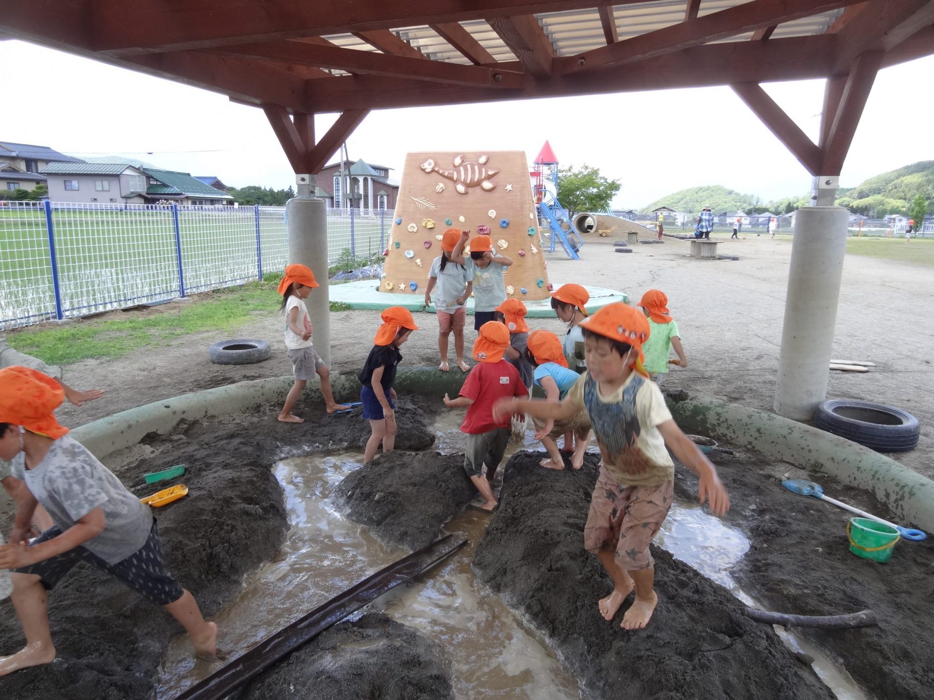 水遊びの楽しい季節。登園すると泥んこ着に着替えて裸足で外へ向かっていきます。