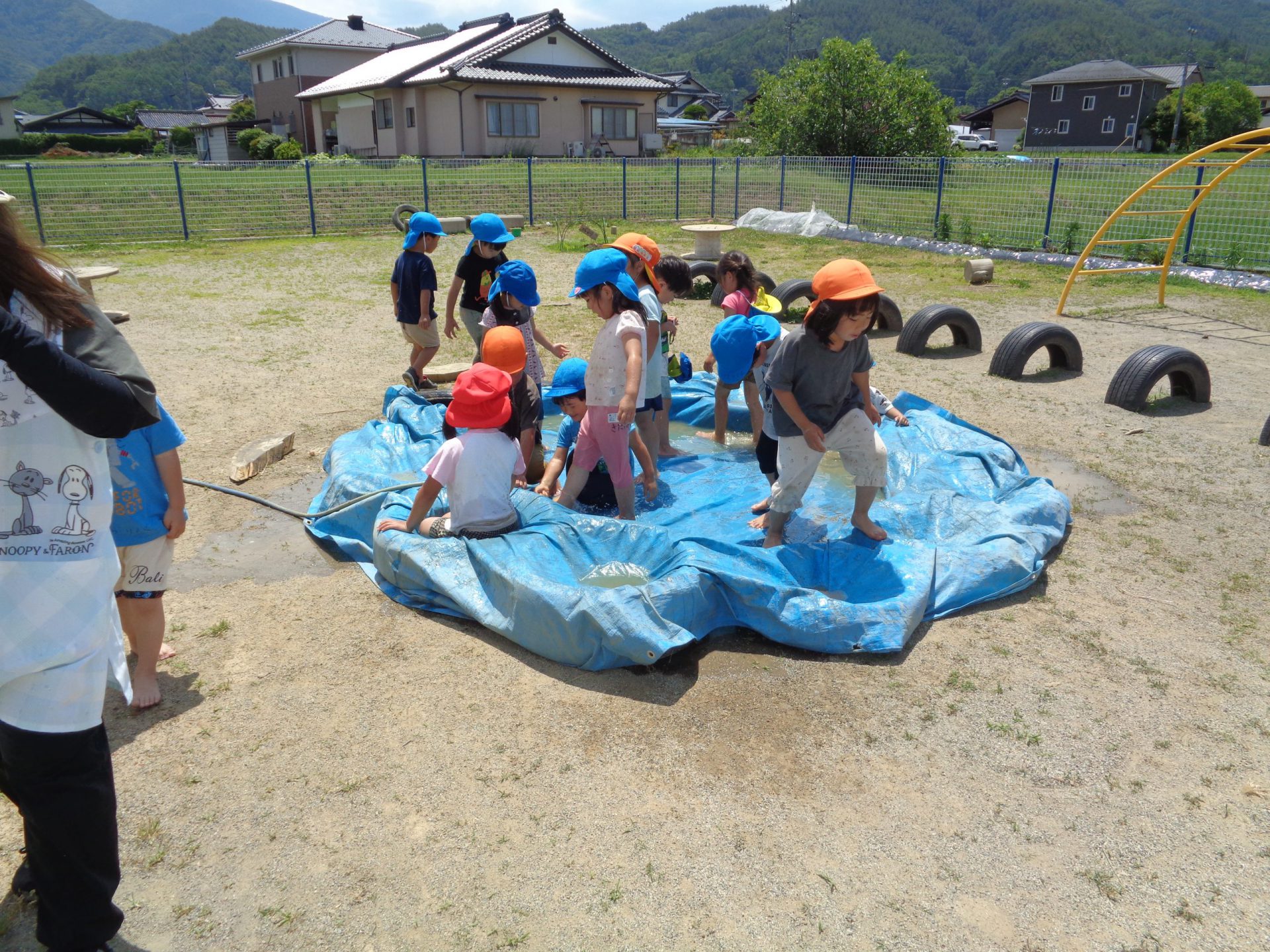 水をためて楽しみました。泥んこがちょっと苦手な子も、シートにみずがたまると「ちょっと入ってみよう!」という気持ちになってきて・・・