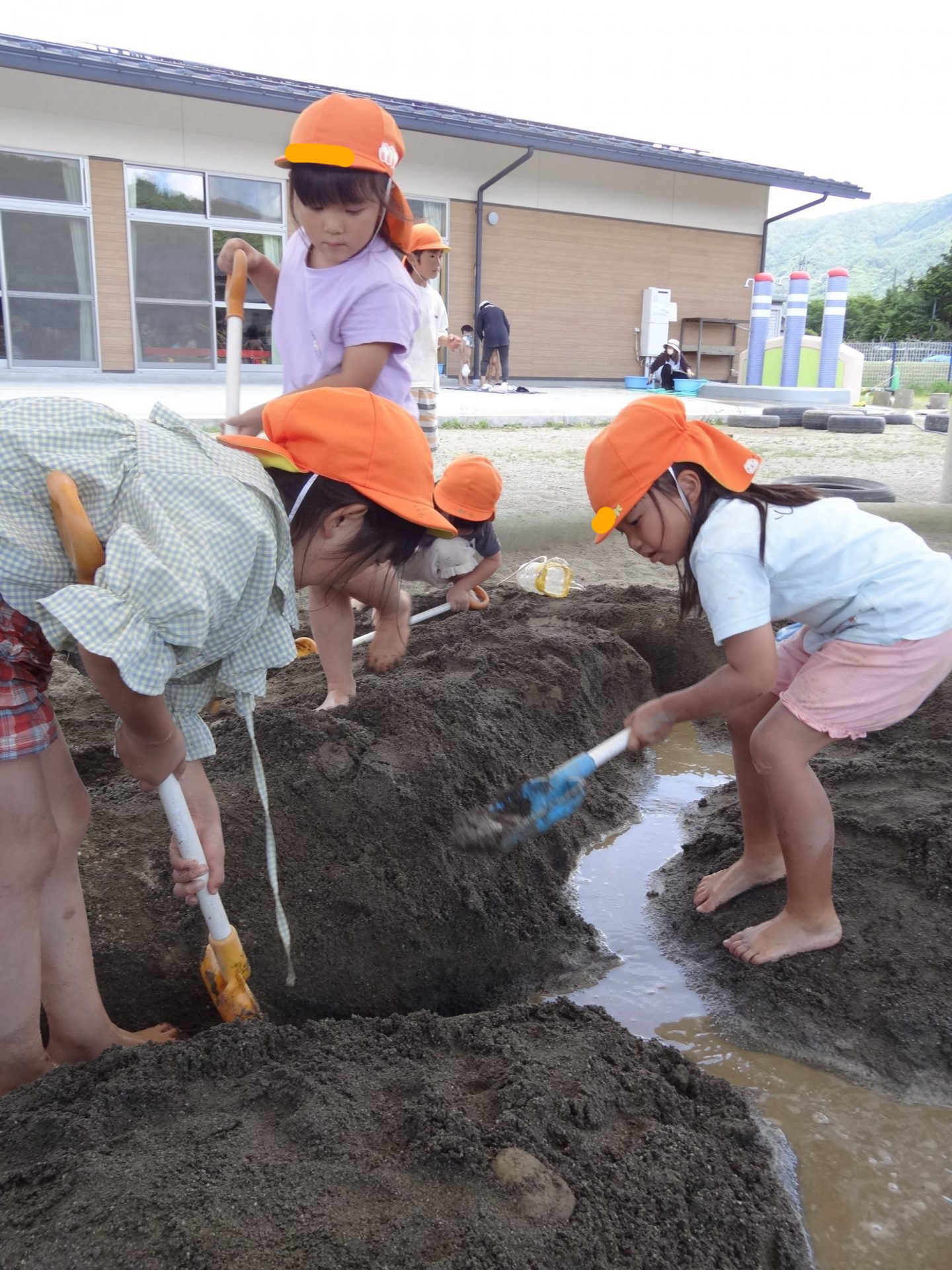 「分かった!!こっちは坂(高い)になってるから行かないんだよ!みんなもっと掘って~!!」