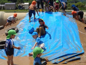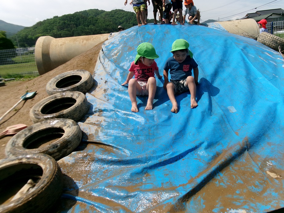 「ツルツル滑る~」「きゃぁ―!!」と歓声を上げながら楽しむ年中さん。