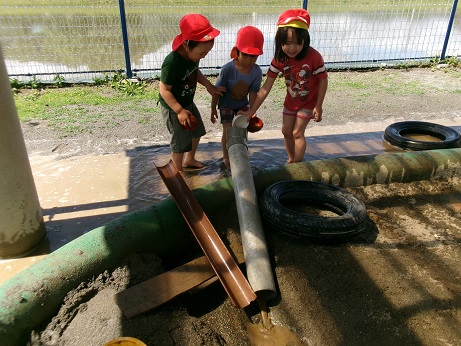 塩ビ管をケーブルドラムに置いて水を流していくと、高低差ができ、よく流れる水に「わぁー」と大歓声の年少さんでした。