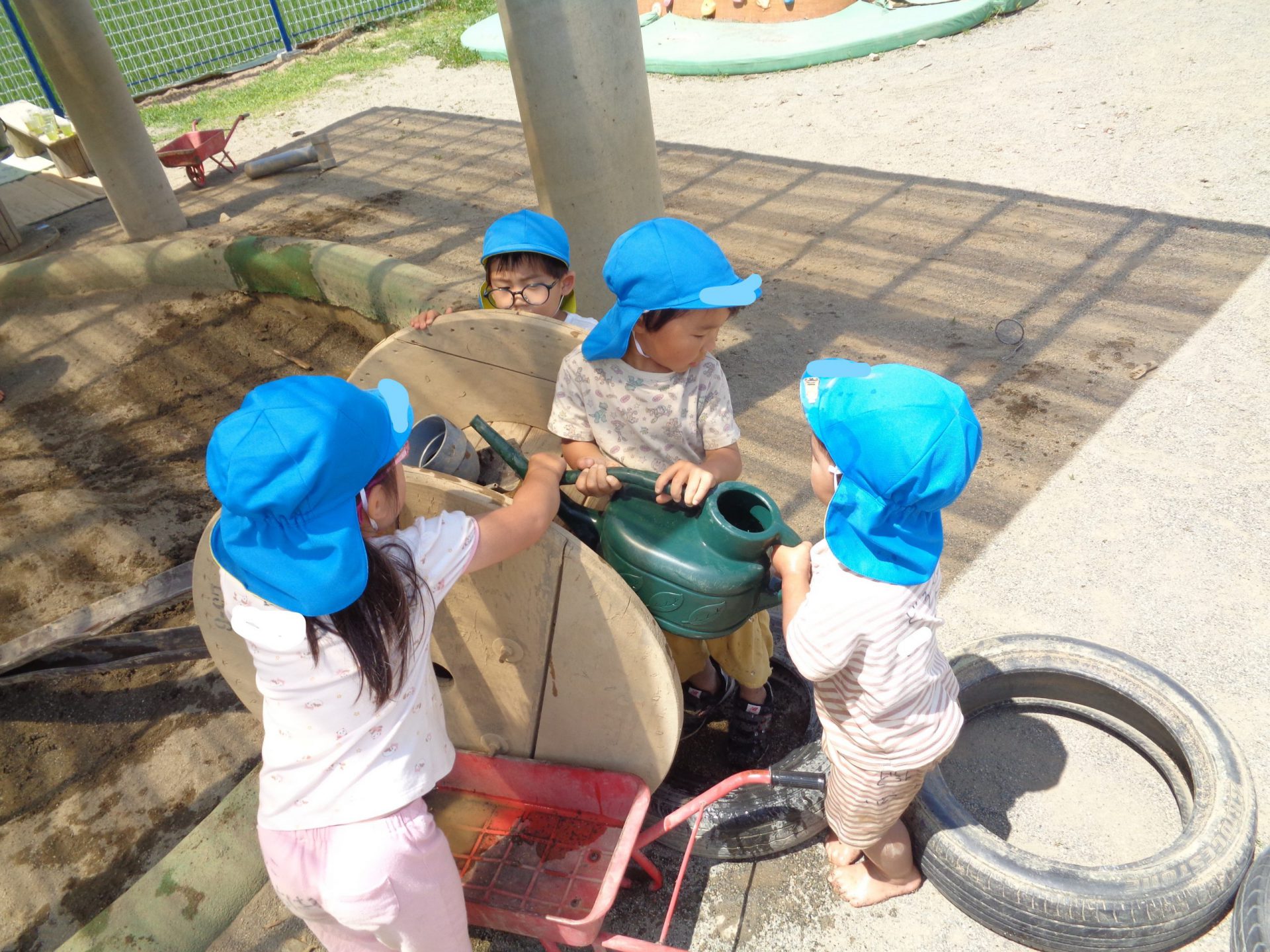 バケツやじょうろで何回も水を汲みに行ったり、「ホースを使ったらどんどん水を流せるよ!」という意見も出てきています。