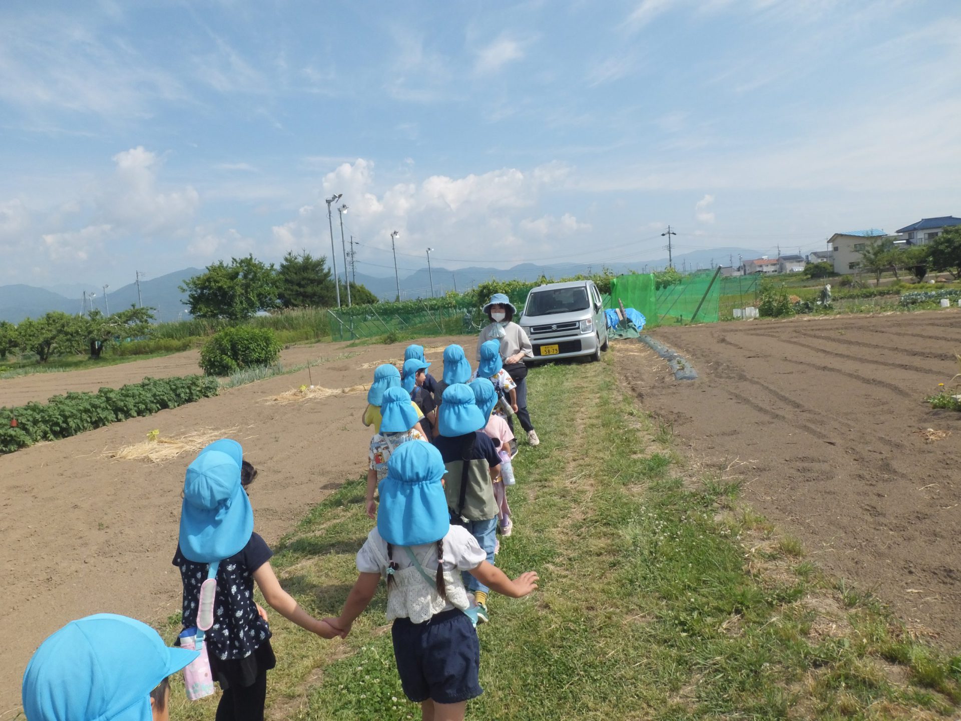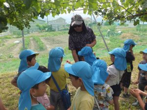 「みんな、ぶどうの袋に絵を描いたかな?ぶどうがもう少し大きくなったら、みんなが描いた袋をぶどうにかけてあげようね」