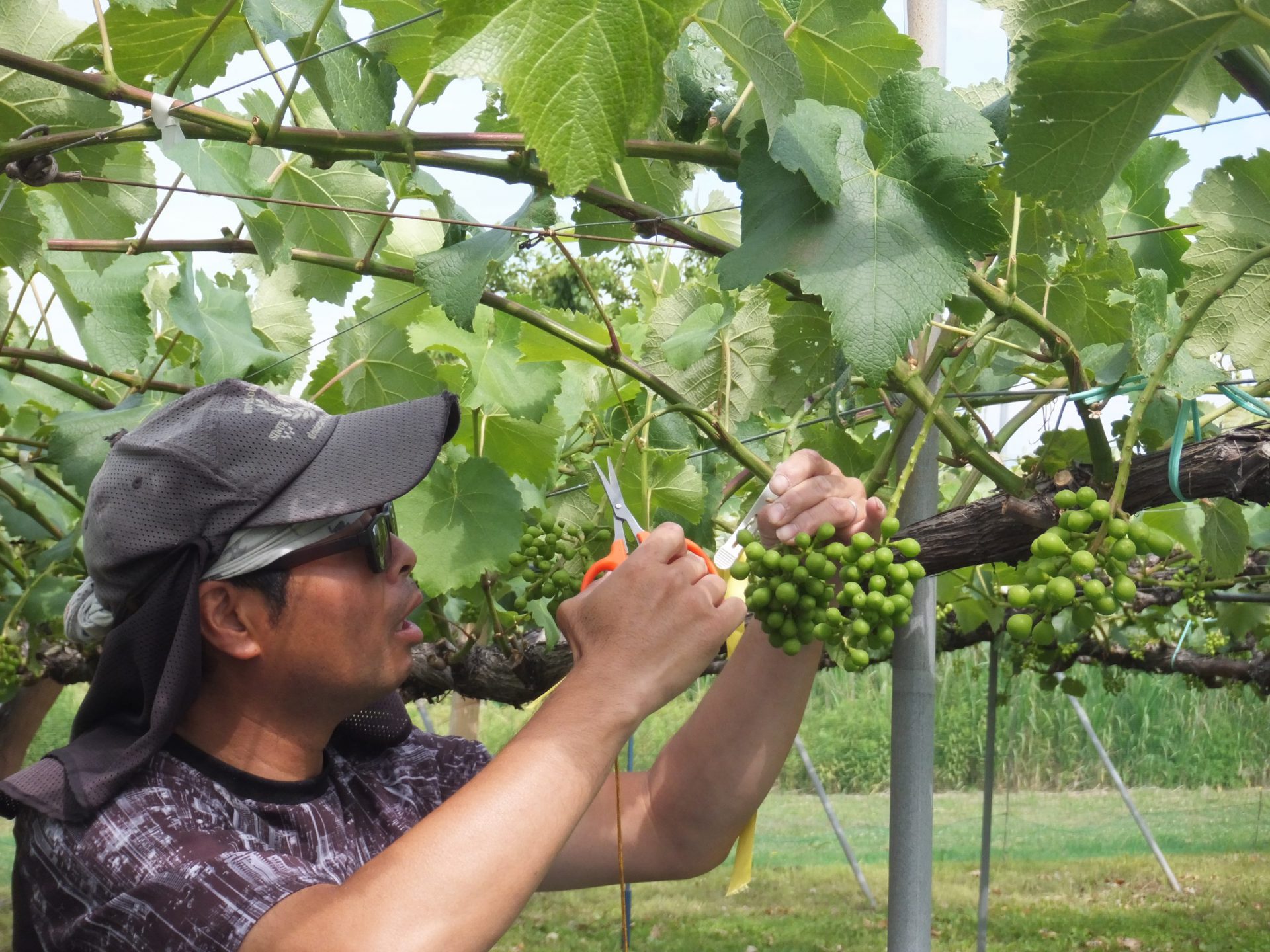 「こうやって余計な実を取ってあげるんだよ。そうしないと、ぶどうの実が大きくならないし、実が潰れてしまうこともあるんだよ。」