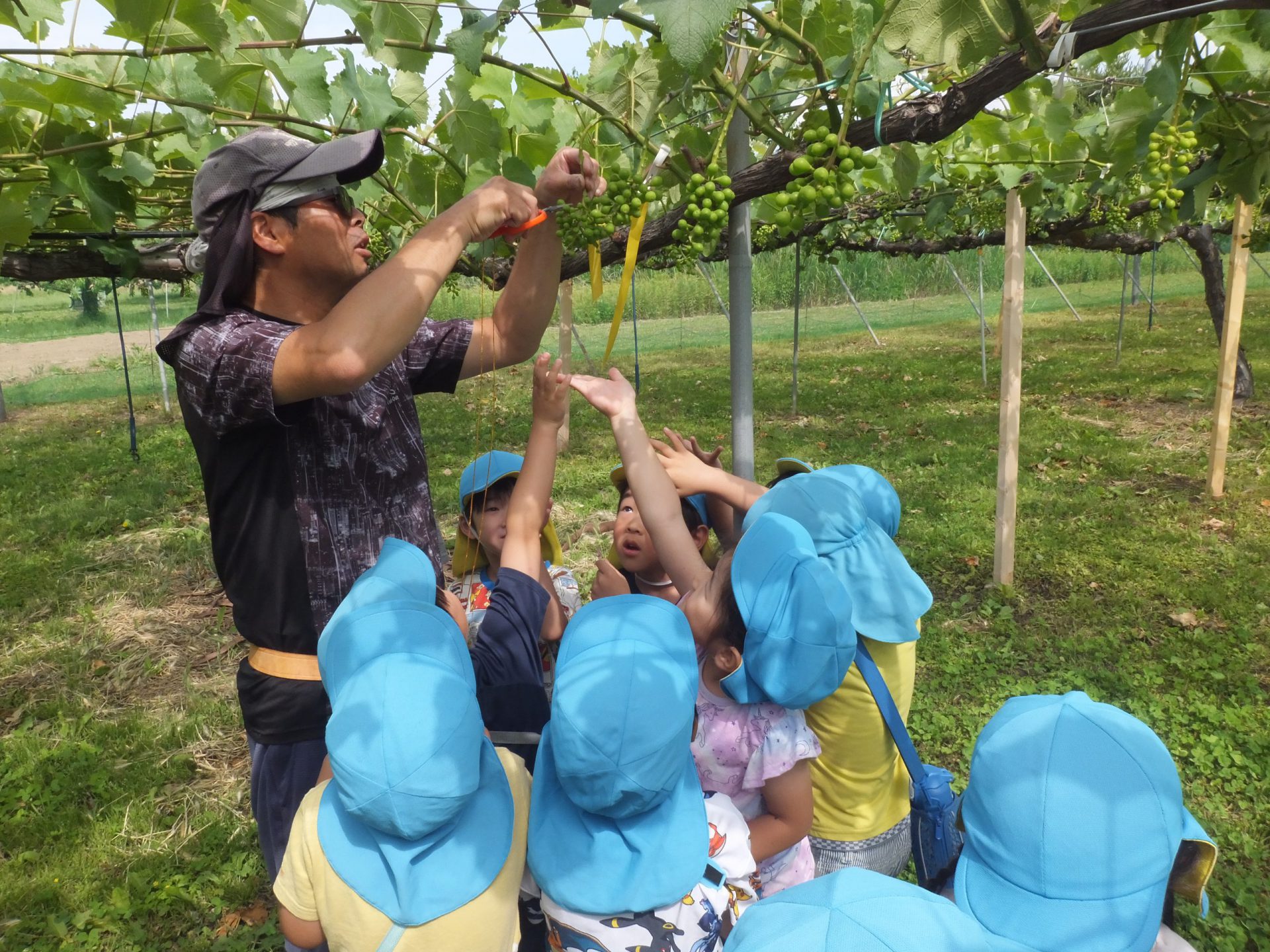 「ちょうだい、ちょうだい!」まだ青い実なのに、子ども達はぶどうの実が欲しくてたまりません。