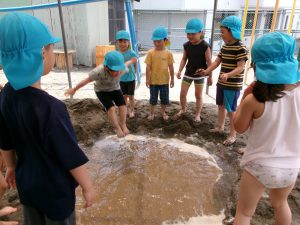 久しぶりの泥遊びに勢いよく飛び出していく子どもたち。裸足で遊ぶ感覚に少し戸惑いをみせる子もいましたが、「こっちは冷たくて気持ちいい」「こっちはあっつい!やけどする」と温度や触感に気づきながら楽しむ姿がありました。