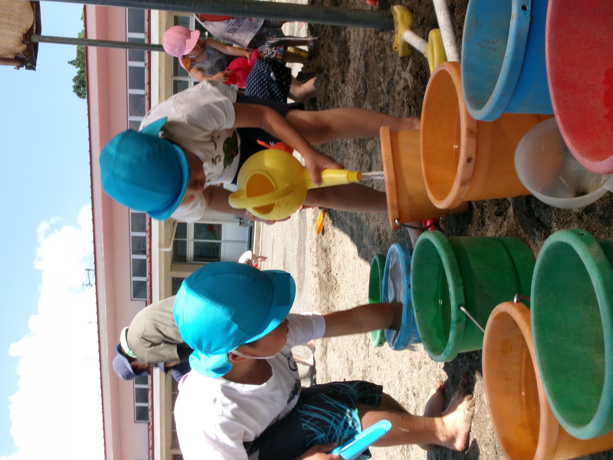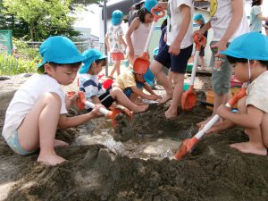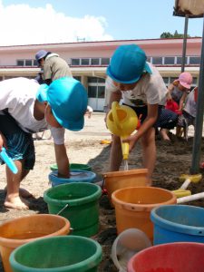 穴を掘ってから水を入れるという工程にこだわっていた子ども達ですが、場所を移動すると「水入れていいよ!」と最初から水を入れ始めました!?