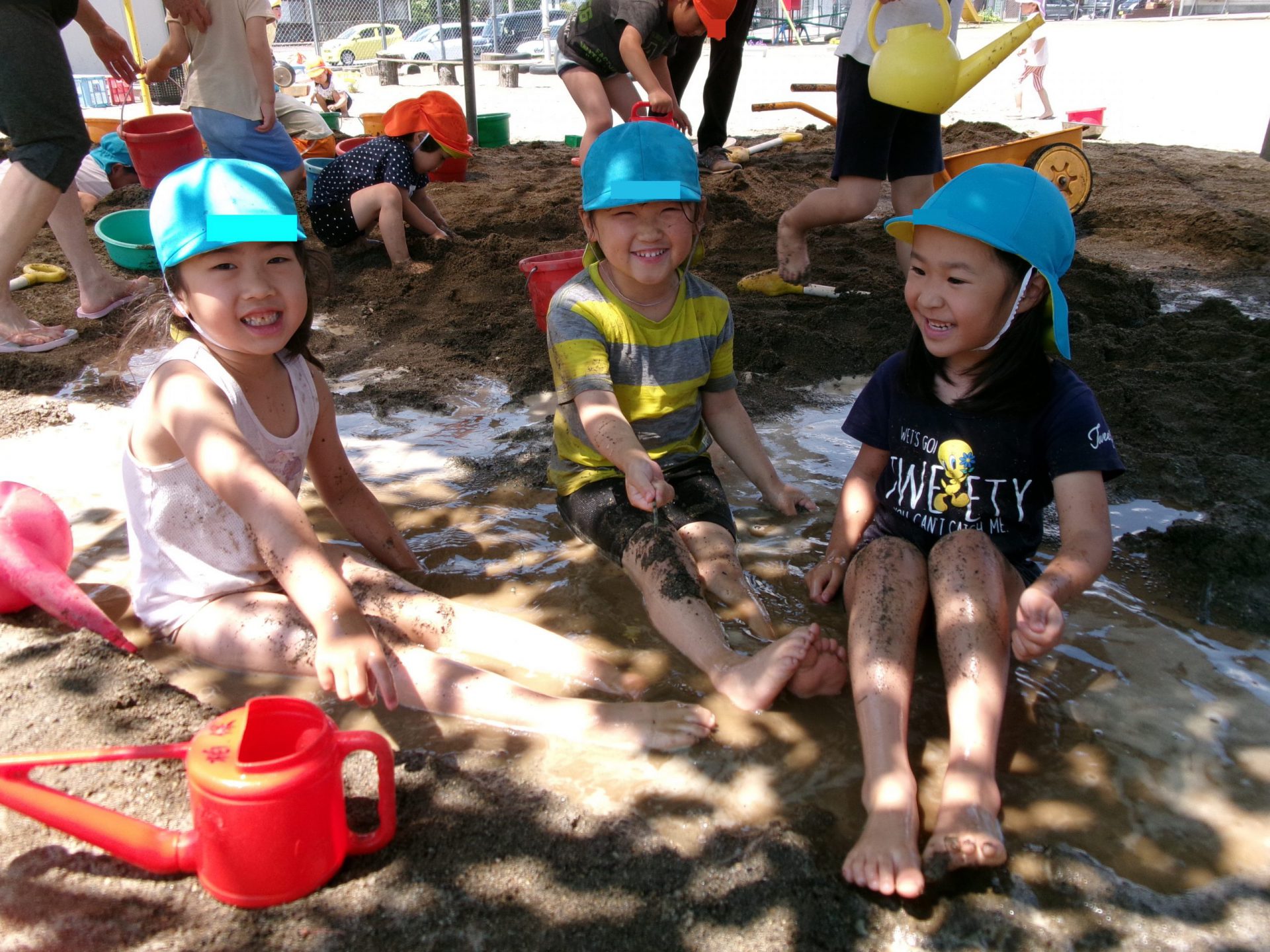 「僕も一緒に掘りたい!」「僕も!」と遊びの輪が広がり、「こうしたら?」「やってみようよ!」とどんどん発展していった泥んこプールづくり。完成したものを友だちと共有したい!という気持ちも高まり、クラス全員での遊びへと広がっていきました。