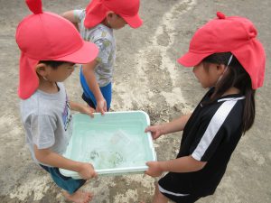 園庭に出ると、子どもたちが水を運んでいます。どこに持って行くのかな?