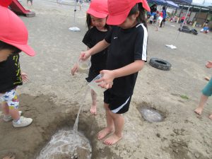 「水持ってきたよ」「ありがとう!」「もう一回汲んでくる。混ぜといて」と水運び役・混ぜる役で自然と役割分担ができています。