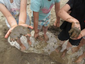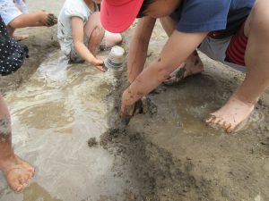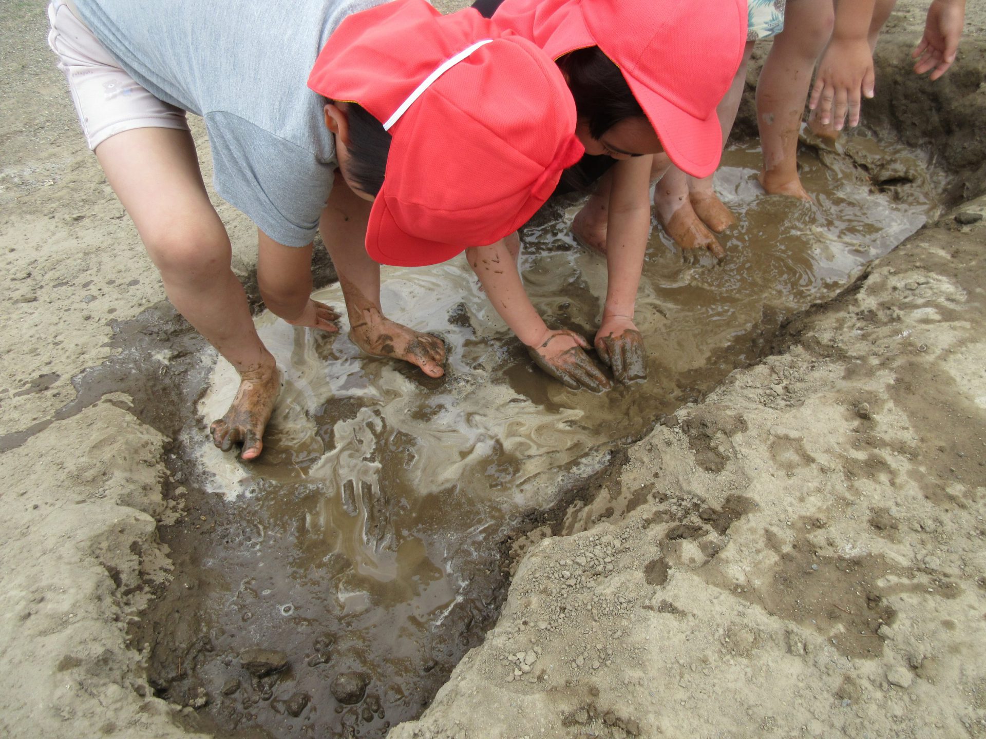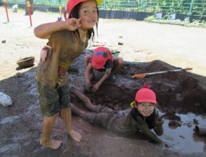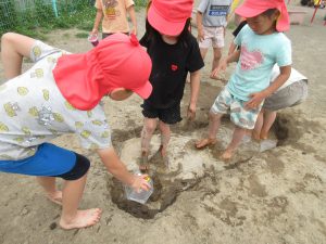 「何やっているの?」と、近くにいた子どもたちも集まってきて、穴の中に入って混ぜています。